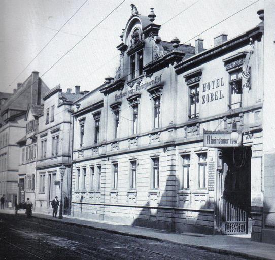 Keywords: Frankfurt-Bockenheim Adalbertstraße 16 1906.jpg Akroterion als Architekturelement der Bekrönung des Giebelfirstes sowie zahlreiche Vasen und natürlich auffallende Voluten an den Giebelecken Hinter dem Hotel/Gasthausgebäude an der Straßenfront vormals Schöne Aussicht dann nach Eingemeindung 1895 Adalbertstraße gab es noch einen Gartenlokalbereich sowie ergänzende Gebäude wie Kegelbahn Apfelwein-Kelterhaus und ein Vereinssaal für Veranstaltungen Hier veranstaltete z B am Samstag den 11 02 1893 die Bockenheimer Turngemeinde einen Maskenball Gemäß Auszug aus der ALLGEMEINEN DEUTSCHEN LEHRERZEITUNG 1896 fand in Bockenheim im 'Rheingauer Hof' die 28 Jahresversammlung der israelitischen Lehrer Kurhessens statt Nach dem Stadtchronist Hermann Ludwig wurde das Gasthaus 1830 erbaut 1832 weiterverkauft an Bücking 1839 an Jean Pierre Jansen 1857 entstand der Saalbau als Hinterhaus 1882 erwarb den Rheingauer Hof zeitweise der Rheinische Actien-Verein für Weinbau und Weinhandeles Dilthey Sahl Comp als Hotel Kräusel Zu der Gründern dieser 1867 errichteten Gesellschaft gehörte Theodor Dilthey aus einer der größten Rheingauer Weinhändlerfamilien und Erster Präsident der Wiesbadener Industrie- und Handelskammer In den 1880er Jahren entwickelte sich die Gesellschaft zum Hoflieferanten des Kaisers von Österreich sowie des russischen Zaren Um 1900 kaufte den Rheingauer Hof der Hotelier Jean Zobel daher auch Namensbenennung Hotel Zobel siehe Foto der Frontseite 1935 war seine Tochter Frl A M Zobel Eigentümerin Während des Zweiten Weltkriegs wurden hier Zwangsarbeiter für Hartmann Braun AG einquartiert Fliegerbomben zerstörte das Gebäude 1944 Heute steht hier ein Wohn- und Geschäftshauskomplex mit einer Tiefgarageneinfahrt Source Author 1906 Buildings in Frankfurt-Bockenheim History of Frankfurt-Bockenheim Adalbertstraße Cc-zero |