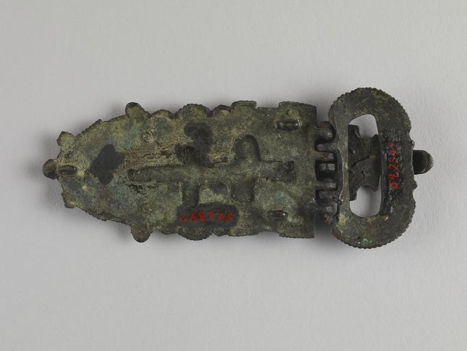 Keywords: Frankish - Belt Buckle - Walters 542347 - Back.jpg This highly decorative buckle is unusual in that it is made of two pieces riveted together It is decorated with incised and punched patterns and features a cross at the center The tongue has a schematic human face and an animal head terminal Such animal head terminals are common on Migration period jewelry century 7 Early Medieval bronze cm 5 5 13 7 1 accession number 54 2347 34764 Joseph Brummer New York Joseph Brummer Sale Parke-Bernet Galleries New York May 12 1949 no 278 Walters Art Museum 1949 by purchase Museum purchase 1949 Early Christian and Byzantine Art Baltimore Museum of Art Baltimore 1947 Jewelry - Ancient to Modern The Walters Art Gallery Baltimore 1979-1980 place of origin Burgundy France Walters Art Museum license Medieval metalwork in the Walters Art Museum Merovingian belt buckles Media contributed by the Walters Art Museum needs category review |