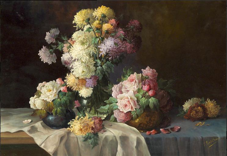 Keywords: Frans Mortelmans - Three vases of chrysanthemums and roses on a table.jpg Artwork Creator Frans Mortelmans 1885-1936 Oil on canvas size cm 70 5 100 3 accession number object history credit line signed 'F Mortelmans' lower right Auctioned by Bonhams 16 May 2007 in San Francisco lot 89 http //www bonhams com/auctions/15252/lot/89/ PD-old-100 Frans Mortelmans 19th-century still life paintings 20th-century still life paintings |
