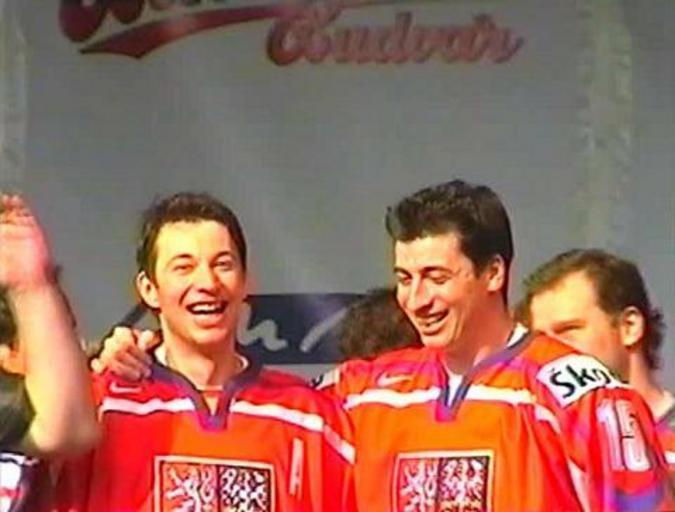 | Keywords: František Kaberle and Tomáš Kaberle.JPG Čeští hokejisté František Kaberle vlevo a jeho bratr Tomáš Kaberle Czech ice hockey players František Kaberle left and his brother Tomáš Kaberle own - frame capture from homemade video Jarba 2005-05-15 Tomáš Kaberle Arrival of the Czech national ice hockey team Old Town Square 15 May 2005 František Kaberle |