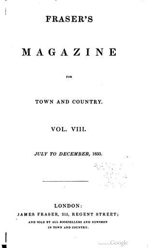 | Keywords: Fraser's Magazine 1833.jpg en Title-page of vol 8 of Fraser's Magazine 1833 ru Титульный лист восьмого тома Ф ейзе с эгэзин за 1833 год http //books google com/books id T8ERAAAAYAAJ printsec frontcover v onepage q f false James Fraser 1833 PD-Art Magazines of the United Kingdom 1833 magazines |