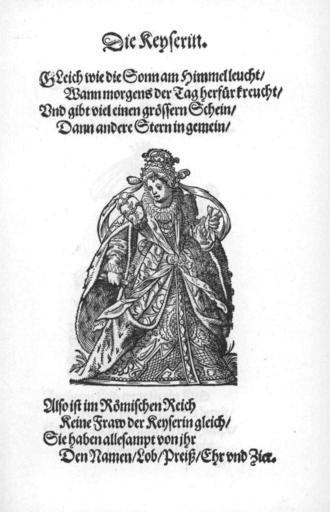 Keywords: Frauen-Trachtenbuch 001.jpg 0006 002 Die Keyserin Holy Roman Empire Ermine clothing in art Paintings by Jost Amman with fur Fur clothing of native people of Germany Fur fashion in 1586