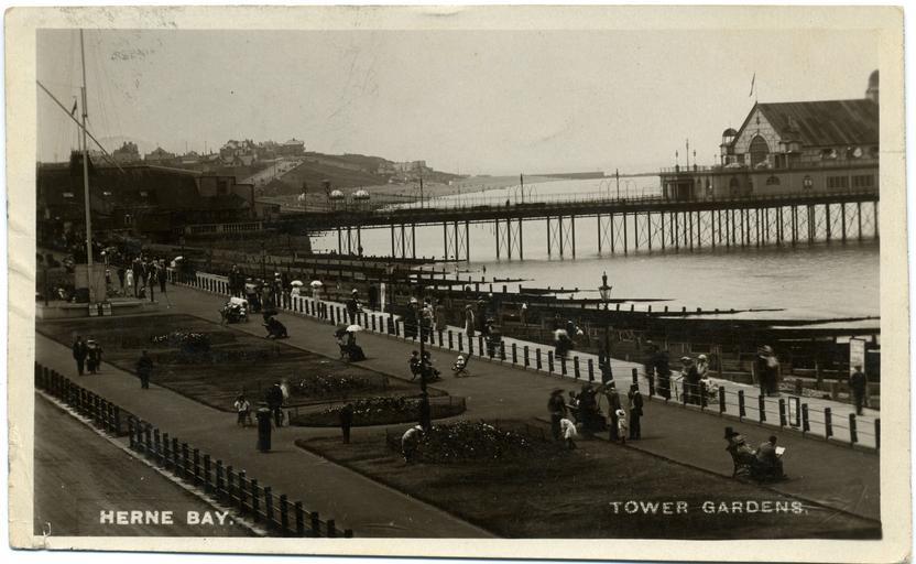 Keywords: Fred C Palmer Herne Bay 1913 001.jpg Postcard photo of the Tower Gardens Herne Bay Kent dated 1910-1913 The photographer was Fred C Palmer of Tower Studio Herne Bay Kent who is believed to have died 1936-1939 ;Points of interest It is unusual to see an un-posed seaside postcard from this era; several passers-by are smudged due to movement and they are apparently unaware of being photographed The buildings in the background towards Westcliff have been very carefully touched up view at full-size to see detail Westcliff is not yet all built up in 1913 Hampton pier visible in the background had been rebuilt as a concrete stub in 1903-1904 and the end of that pier was allowed to fall derelict The work was done to prevent further erosion at Hampton-on-Sea on the west side of Hampton Pier but this image shows the extreme build-up of shingle on the east side of the pier in 1913 while Hampton-on-Sea continued to be eroded The old London Bridge balustrade given to Herne Bay in 1831 after the bridge was demolished had stood at the entrance of the first Herne Bay pier This stone balustrade was moved to fit around the 1884-1928 theatre and both theatre and balustrade can be seen at the head of the third pier in this postcard The balustrade was removed in 1953 after a storm and its present whereabouts is unknown Editing This is an unedited scan of the original postcard It is politely requested that edited versions of this historical item are uploaded separately for the following reasons Thank you Border The remaining border of this image is important for researchers of this photographer Some photographers trimmed their images more than others and Palmer has a reputation for producing smaller postcards than other early 20th century UK photographers He took his own photos developed them in-house onto postcard-backed photographic paper and trimmed them himself It is worth adding that during hand-developing the border is actively masked with equipment which both crops the picture and causes the white frame or border to appear on the paper This frame is part of the design and is one of the reasons why the quality of Palmer's work is so interesting and why there is an article and category for him on English Wiki Researchers need to see exactly where the edge of the postcard is Thank you for taking the time to read this Contrast The dark areas in this image have darkened with age and the light areas have faded Any adjustment of contrast would lose detail in either the lighter or darker areas Scan of original postcard in my possession 1910-1913 Evidence the Grand Pier Pavilion was built in 1910; the card is postmarked 1913 Fred C Palmer died 1936-1939 out of copyright Reverse of same postcard File Fred C Palmer Herne Bay 1913 002 jpg PD-old-70-1923 Herne Bay Kent Fred C Palmer of Herne Bay |