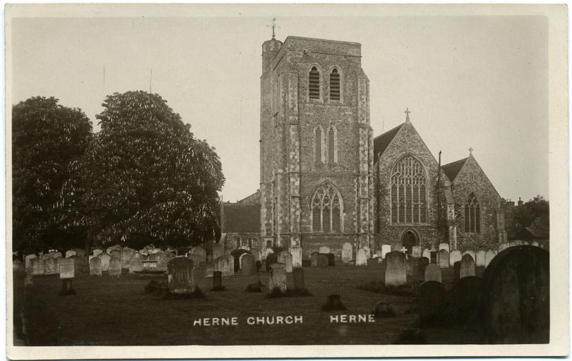 Keywords: Fred C Palmer Herne Church 004.jpg Postcard photo of St Martins-in-Herne church Herne Kent England The back of the postcard was used to write a letter but it is not postmarked The photographer was Fred C Palmer of Tower Studio Herne Bay Kent who is believed to have died 1936-1939 ;Points of interest The horse chestnut trees in the background are in full flower indicating early summer Many of the gravestones have clear writing on them; this photograph was taken before acid rain blurred many gravestone inscriptions in the UK There are two chimney pipes on the building possibly connected to coal-fired heating boilers Editing This is an unedited scan of an historical photograph If making adjustments to this image please consider uploading your edit as a separate file Contrast This print has darkened with age but it would be inappropriate to adjust the brightness because detail would be lost Border The remaining border of this image is important for researchers of this photographer Some photographers trimmed their images more than others and Palmer has a reputation for producing smaller postcards than other early 20th century UK photographers He took his own photos developed them in-house onto postcard-backed photographic paper and trimmed them himself This is one of the reasons why the quality of his work is so interesting and why there is an article and category for him on English Wiki Researchers need to see exactly where the edge of the postcard is Thank you for taking the time to read this Scan of original postcard in my possession 1903-1918 Fred C Palmer died 1936-1939 out of copyright Another postcard of Herne showing the church tower by Fred C Palmer File FCP Herne 005 jpg PD-old-70-1923 Fred C Palmer of Herne Bay St Martin's Church Herne Kent |