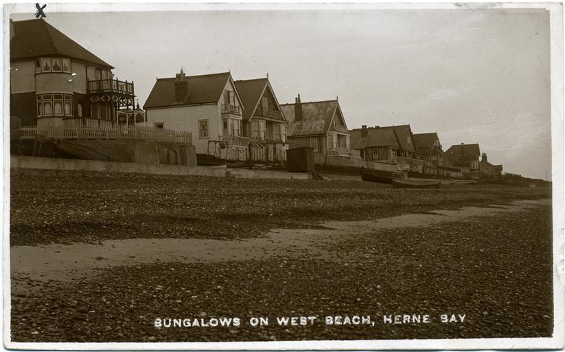 | Keywords: Fred C Palmer The Shingles.jpg Postcard photo of the sea front at Herne Bay Kent England 1903-1912 The Shingles marked with a cross on the postcard was a guest house on the west beach of Herne Bay At the time there were rumours of Bohemian goings-on in these isolated houses and it is known that nude bathing took place on early mornings when the tide was in The photographer was Fred C Palmer of Tower Studio Herne Bay Kent who is believed to have died 1936-1939 Points of interest Today a bungalow can be any single-storey domestic building but at that time it meant a colonial-style domestic building of one or two storeys often with an exterior gallery and balconies Note the Kentish hoys small boats on the beach The rectangular wood frames pulled up above the tideline for winter may be for trade kiosks bathers' changing rooms or for shade when covered with canvas Border The remaining border of this image is important for researchers of this photographer Some photographers trimmed their images more than others and Palmer has a reputation for producing smaller postcards than other early 20th century UK photographers He took his own photos developed them in-house onto postcard-backed photographic paper and trimmed them himself It is worth adding that during hand-developing the border is actively masked with equipment which both crops the picture and causes the white frame or border to appear on the paper This frame is part of the design and is one of the reasons why the quality of Palmer's work is so interesting and why there is an article and category for him on English Wiki Researchers need to see exactly where the edge of the postcard is Thank you for taking the time to read this Scan of original postcard in my possession Postmarked 1912 Fred C Palmer died 1936-1939 out of copyright PD-old-70-1923 Herne Bay Kent Fred C Palmer of Herne Bay |