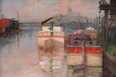 | Keywords: Fred Wagner, Coal Barges on the Lower Schuylkill, c.1905.jpg en Coal Barges on the Lower Schuylkill oil on canvas painting by Fred Wagner c 1905 Newman Galleries Philadelphia Fred Wagner ~ 1905 PD-old-auto 1940 Schuylkill River Barges of the United States Fred Wagner Coal barges |