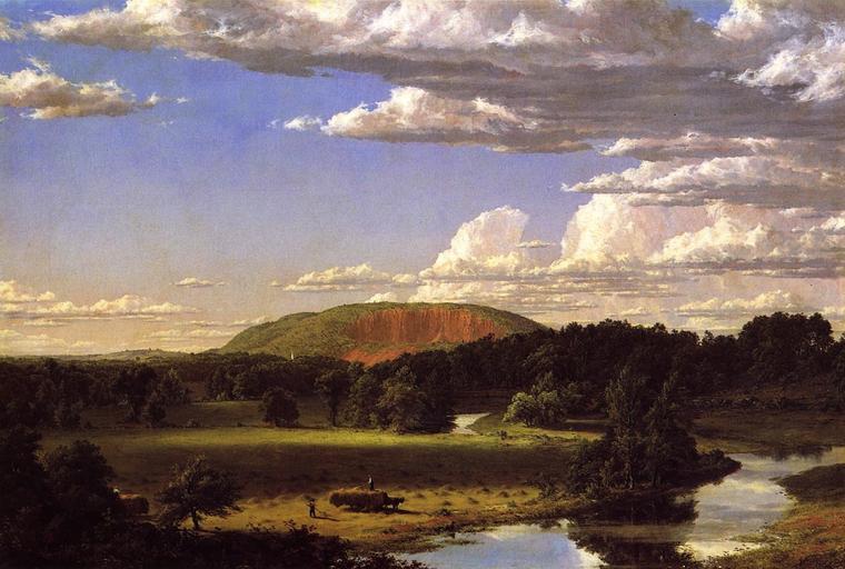 Keywords: frederic church painting art artistic artistry oil on canvas landscape sky clouds nature outside country countryside trees scenic mountains forest woods stream water reflections men farm rural working