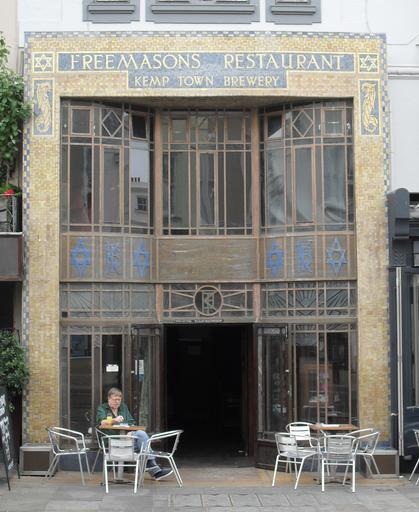 | Keywords: Freemasons Restaurant, Western Road, Hove (Restaurant Façade).jpg Freemasons Inn and Restaurant 39 Western Road Brunswick Town Hove City of Brighton and Hove East Sussex restaurant façade The inn was built in about 1850; an elaborately decorated Art Deco-style restaurant was added in 1928 http //www heritagegateway org uk/Gateway/Results_Single aspx uid 365664 resourceID 5 Listed at Grade II by English Heritage IoE Code 365664 own 2010-07-10 The Voice of Hassocks Grade II listed buildings in Brighton and Hove Buildings in Hove 2010 in East Sussex July 2010 in England Mosaics in the United Kingdom |