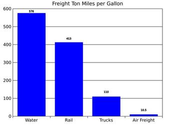 | Keywords: Freight Ton Miles per Gallon.svg translate yes en Fuel efficiency of various shipping methods Water is the slowest but the most efficient air is the fastest but the least efficient At the same speed though rail is more efficient than water transport Data from https //www fra dot gov/eLib/Details/L02696 and http //transportation mit edu/sites/default/files/documents/MIT_Air_Cargo_Productivity_Report pdf 2015-07-20 own Delphi234 other versions cc-zero Uploaded with UploadWizard Energy efficiency Air cargo Freight rail transport Transport trucks Water transport |