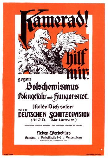 | Keywords: Freikorpsplakat (1919).JPG de H Wissmann Werbeplakat der deutschen Freikorps Berlin 1919 Text Kamerad Hilf mir gegen Bolschewismus Polengefahr und Hungersnot Melde Dich sofort bei der DEUTSCHEN SCHUTZDIVISION 31 J D Abt Lüttwitz Mobile Löhnung 5 00 Mark Tageszulage Freie Unterbringung Verpflegung und Ausrüstung 90 0 x 60 0 cm ru Х Виссманн Агитационный плакат ге манского доб овольческо го ко пуса Бе лин 1919 Текст Това ищи Помогите мне П отив большевизма польской опасности и голода Записывайся не медля в дивизию ополчения 31-я еге ская дивизия отд Люттвиц Жалованье в зависимости от звания Ежедневная п ибавка 5 00 ма ок Бесплатные ночлег питание и сня яжение 90 0 х 60 0 см Einst und Jetzt bd 31 1986 S 51 genehmigt vom Reichswehrministerium Freikorps Weimar Republic Posters PD-old |