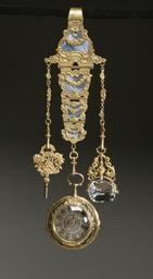 Keywords: French - Chatelaine with Watch - Walters 5816.jpg Decorative chatelaines were worn by men and women as pendants and multifunctional devices for carrying utensils like watches signet seals and sewing accessories They were suspended from the waistband by means of the hook at the top and the flexible separate panels adjusted to the movements of the wearer The watch and chatelaine are decorated with elaborate scrollwork and garlands over beautifully striated agate The chatelaine is fitted with a watch key and a revolving rock crystal seal neither of which were likely made at the same time as the chatelaine and watch century 18 gold gilt metal agate rock crystal watc cm 17 6 ; chatelaine cm 12 7 l accession number 58 16 38933 Henry Walters Baltimore date and mode of acquisition unknown Walters Art Museum Henry Walters Acquired by Henry Walters Inscribed frs frères Melly à Paris Jewelry - Ancient to Modern The Walters Art Gallery Baltimore 1979-1980 Objects of Adornment Five Thousand Years of Jewelry from the Walters Art Gallery Baltimore Cooper-Hewitt National Design Museum New York; Chrysler Museum of Art Norfolk; Carnegie Museum of Art Pittsburgh; San Antonio Museum of Art San Antonio; Philbrook Museum of Art Tulsa; Honolulu Academy of Arts Honolulu; New Orleans Museum of Art New Orleans; Milwaukee Art Museum Milwaukee; Minneapolis Institute of Arts Minneapolis; Toledo Museum of Art Toledo; The John and Mable Ringling Museum of Art Sarasota 1984-1987 Jewelry from the Walters Art Museum and the Zucker Family Collection The Walters Art Gallery Baltimore 1987 Bedazzled 5 000 Years of Jewelry from the Walters Art Museum Frist Center for the Visual Arts Nashville; The John and Mable Ringling Museum of Art Sarasota; The Walters Art Museum Baltimore 2006-2009 Bedazzled 5 000 Years of Jewelry El Paso Museum of Art El Paso 2010 place of origin France Walters Art Museum license Jewellery in the Walters Art Museum Art of France in the Walters Art Museum Media contributed by the Walters Art Museum needs category review Chatelaines |