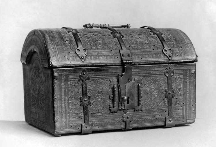 | Keywords: French - Coffret and Key - Walters 7312 (2).jpg Coffrets or small boxes covered with leather were often used to store documents or other desk objects It is decorated with floral patterns and includes two inscriptions on the right J'ay bien choisi I have chosen well ; and on the left Son voulloir est le myen His will is my will The box was originally painted with red and blue against a natural leather background and had gilt details ca 1425 1450 Late Medieval wood paint and gilt on leather wrought iron with hinges cm 18 28 8 18 4 accession number 73 12 26415 Henry Walters Baltimore date and mode of acquisition unknown Walters Art Museum Henry Walters Acquired by Henry Walters The International Style The Arts in Europe Around 1400 The Walters Art Gallery Baltimore 1962 place of origin France <gallery> File French - Coffret and Key - Walters 7312 jpg </gallery> Walters Art Museum license Caskets furniture Medieval art in the Walters Art Museum Renaissance applied arts in the Walters Art Museum Art of France in the Walters Art Museum Media contributed by the Walters Art Museum needs category review |