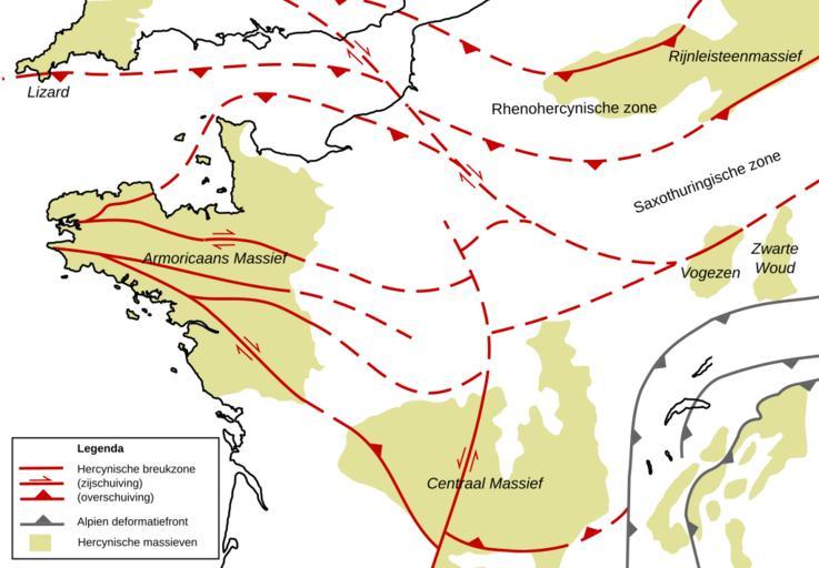 | Keywords: French Hercynian massifs NL.svg Service Géologique National ; 1996 Carte géologique de la France au millionième Éditions BRGM 6<sup>e</sup> druk Paris Debelmas J ; 1974 Géologie de la France 1 vieux massifs et grands bassins sédimentaires Doin éditeurs Paris ISBN 2-7040-0011-5 Martínez-Catalán J R ; 1990 A non-cylindrical model for the northwest Iberian allochthonous terranes and their equivalents in the Hercynian belt of Western Europe Tectonophysics 179 pp 253-272 Matte Ph ; Maluski H ; Rajlich P Franke P ; 1990 Terrane boundaries in the Bohemian Massif Result of large-scale Variscan shearing Tectonophysics 177 pp 151-170 Pharaoh T C ; 1999 Palaeozoic terranes and their lithospheric boundaries within the Trans-European Suture Zone TESZ a review Tectonophysics 314 pp 17-41 own Woudloper date Variscan orogeny Geological maps of the Netherlands Geological maps of Belgium Geological maps of France Geological maps of Germany SVG geology Structural geology maps Maps in Dutch |