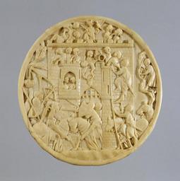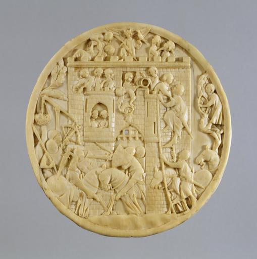 Keywords: French - Mirror Case with Attack on the Castle of Love - Walters 71169 - Top.jpg The popularity of ivory luxury goods reached its height around 1350 but they were made well into the 15th century Associated with intimacy mirrors were often given as courting gifts A portable mirror consisted of a case in two parts with a polished metal disk fitted inside In this allegorical battle scene knights attack ladies in a castle using catapults and crossbows that launch flowers The ladies also shower their adversaries with flowers dropped from buckets The god of love presides over all A single knight has reached his lady by scaling the wall This scene and those of the knights riding away may be three moments in an elopement narrative The case originally had fantastic animals forming the four corners between 1320 1340 Medieval ivory Diam 5 3/16 x D 3/8 in 13 2 x 1 cm accession number 71 169 24521 Treasury of the Cistercian Abbey of Rein Styria Jacques Seligmann Paris 1928 by purchase Henry Walters Baltimore December 1 1928 by purchase Walters Art Museum Henry Walters Acquired by Henry Walters 1928 Illuminated Manuscripts Masterpieces in Miniature The Walters Art Gallery Baltimore 1984-1985 Medieval Games of Love and War The Walters Art Gallery Baltimore 1995-1996 Images in Ivory Precious Objects of the Gothic Age The Detroit Institute of Arts Detroit; The Walters Art Gallery Baltimore 1997 Highlights from the Collection The Walters Art Gallery Baltimore 1998-2001 The Book of Kings Art War and the Morgan Library's Medieval Picture Bible The Walters Art Museum Baltimore; Academy of the Arts Easton Easton; Princeton University Art Museum Princeton; The Mitchell Gallery Annapolis; Williams College Museum of Art Williamstown 2002 place of origin France Walters Art Museum license French carved ivory mirror cases in the Walters Art Museum 14th-century carved ivory mirror cases Sieges in art Assault on the Castle of Love |