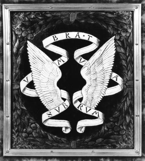 | Keywords: French - Plaque with Emblem - Walters 44284.jpg  A rectangular plaque displays an oval wreath of laurel leaves enframing a device composed of a pair of wings and a scroll inscribed SVB VMBRA TVARTVM alarum- a free rendering of verse 4 of Psalm 90 translated He will overshadow thee with his shoulders and under his wings thou shalt trust The scroll and wings are white; the ground lapis blue; the laurel leaves green with clusters of fruit at the angles and fillets in amber color In the corners sprays of leaves are indicated in gilding ca 1530 1540 technique painted enamel copper cm 22 3 20 accession number 44 284 24139 Anatole Demidoff Prince of San Donato date and mode of acquisition unknown Collections de San Donato Sale Paris March 22 1870 lot 468 Henry Willett Brighton England date and mode of acquisition unknown Sale London April 7 1905 no 98 George Robinson Harding London date and mode of acquisition unknown Henry Walters Baltimore date and mode of acquisition unknown Walters Art Museum Henry Walters Acquired by Henry Walters place of origin Limoges France Walters Art Museum license 2D Limoges painted enamels in the Walters Art Museum Art of France in the Walters Art Museum Media contributed by the Walters Art Museum needs category review Painted enamel art in the Walters Art Museum House of Demidov's collections Psalm 90 |