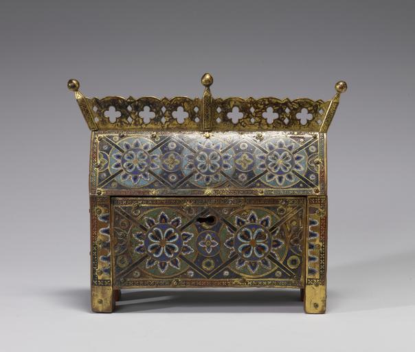 Keywords: French - Reliquary Shrine with Christ and Apostles - Walters 44106 - Side C.jpg A reliquary shrine was made to hold the precious relics or remains of a saint On this example Christ is seated at the center of both the roof and the lower panel flanked by a pair of apostles under gracefully curving arches The half-length figures were made separately and attached to the brightly colored enamel surfaces early Other date century 13 Medieval champlevé enamel on copper with gilding cm 23 5 27 5 9 5 accession number 44 106 9032 Prince de Wagram Boissy-Saint-Leger Brimo de Laroussilhe Paris by purchase Henri Daguerre Paris by purchase Henry Walters city Baltimore Walters Art Museum Henry Walters Acquired by Henry Walters 1928 Enamels Museum of Contemporary Crafts New York 1959 The Arts of Man Dallas Museum of Art Dallas 1962 place of origin Limoges France Walters Art Museum license Medieval metalwork in the Walters Art Museum Champlevé of Europe Limoges champlevé Medieval reliquaries Art of France in the Walters Art Museum |