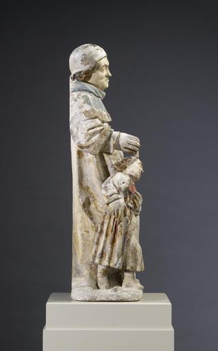 | Keywords: French - Saint Damian - Walters 27285 - Right Side.jpg Medieval medicine offered few cures Christians focused their hopes for recovery from illness or accident on their prayers to saints to intercede for them with God Saints Cosmas and Damian Protasius and Gervasius were two pairs of twin brothers who were invoked for their healing of the sick The statues are from the hospital complex at Abbeville built between 1484 and 1492 where they may have stood in niches at the entrance to the church The vigorous modeling and realistic details- as in the variety in their facial expressions- are made more vivid by the use of color and give credibility to the saints' humanity Their size relative to the sick at their feet conveys their superhuman powers while the clerical garments lend them authority The stocky proportions are typical of French sculpture of the late 15th century Damian seen here with an ointment jar and a spatula prepares to cure a lame man supported by a crutch between 1484 1492 Late Medieval limestone with traces of paint and gilding cm 70 31 8 19 8 accession number 27 285 2645 Hôtel-Dieu Abbeville prior to 1904 from the hospital demolished in 1904 Dikran Kelekian Paris date of acquisition unknown by purchase Henry Walters city Baltimore Walters Art Museum Henry Walters Acquired by Henry Walters 1912 Vive la France French Treasures from the Middle Ages to Monet The Walters Art Gallery Baltimore 1999-2000 place of origin Abbeville France Walters Art Museum license Renaissance sculpture in the Walters Art Museum Art of France in the Walters Art Museum Media contributed by the Walters Art Museum needs category review Vive la France French Treasures from the Middle Ages to Monet |