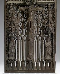 Keywords: French - Tabernacle Door - Walters 52103 - Detail A.jpg Christ on the Cross with the grieving figures of the Virgin and St John is depicted on this door from a tabernacle cabinet that holds the Host or consecrated wafer for the Mass Since the Mass is understood as a ceremonial re-enactment of Christ's sacrifice the imagery is appropriate for the function of the tabernacle The skull at the foot of the cross identifies the site as Golgotha the Place of the Skull and refers as well to the legend that this was also the site of Adam's burial The flamboyant style of the architectural details consistent with church architecture of the time does not detract from the solemnity of the Crucifix Given how difficult it is to work iron the skillful handling of the intricate detail is amazing This was the first medieval object purchased by Henry Walters ca 1500 Late Medieval wrought iron cm 48 3 25 8 6 5 accession number 52 103 19387 Abbey of St Loup Troyes Debruge Dumesnil Sale Paris 184 n 1431 W H Forman Sale London June 19 1899 lot 541 Henry Walters city Baltimore Walters Art Museum Henry Walters Acquired by Henry Walters 1899 place of origin Champagne France Walters Art Museum license Medieval art in the Walters Art Museum Art of France in the Walters Art Museum Media contributed by the Walters Art Museum needs category review |