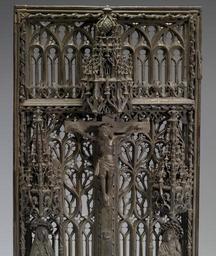 Keywords: French - Tabernacle Door - Walters 52103 - Detail B.jpg Christ on the Cross with the grieving figures of the Virgin and St John is depicted on this door from a tabernacle cabinet that holds the Host or consecrated wafer for the Mass Since the Mass is understood as a ceremonial re-enactment of Christ's sacrifice the imagery is appropriate for the function of the tabernacle The skull at the foot of the cross identifies the site as Golgotha the Place of the Skull and refers as well to the legend that this was also the site of Adam's burial The flamboyant style of the architectural details consistent with church architecture of the time does not detract from the solemnity of the Crucifix Given how difficult it is to work iron the skillful handling of the intricate detail is amazing This was the first medieval object purchased by Henry Walters ca 1500 Late Medieval wrought iron cm 48 3 25 8 6 5 accession number 52 103 19387 Abbey of St Loup Troyes Debruge Dumesnil Sale Paris 184 n 1431 W H Forman Sale London June 19 1899 lot 541 Henry Walters city Baltimore Walters Art Museum Henry Walters Acquired by Henry Walters 1899 place of origin Champagne France Walters Art Museum license Medieval art in the Walters Art Museum Art of France in the Walters Art Museum Media contributed by the Walters Art Museum needs category review |