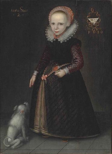 | Keywords: Fresian School Portrait of a Girl Aged 2 1610.jpg Artwork unknown Portrait of a girl aged 2 full-length in a black dress with lace ruff and cuffs a coral necklace and a red bonnet holding a posy in her left hand a dog by her side 1610 Technique oil panel in 41 25 30 object history credit line Ætatis Suis · 2 · top left coat of arms top right Anno 1610 date top right accession number Christie's online 6392 292 5675140 PD-old-100 1610 portrait paintings 17th-century oil on panel paintings 17th-century oil portraits of girls at full length Portrait paintings of girls with dogs |