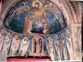 Keywords: Freska vo Sv. Georgij vo Kurbinovo 01.JPG mk Ф ески во Ц квата Св Ѓо ѓи во Ку бинскиот анасти во Ку биново П еспа en Frescos in St Geoge Church in Kurbinovo Prespa Macedonia de Freskos in Georgskirche in Kurbinovo Mazedonien ru Ку биново Це ковь св Гео гия Ку биново акедония http //sankire narod ru/Kurbinovo html Ку биново це ковь св Гео гия 1191г 2004-01-27 02 11 57 author PD-Macedonia PD-Art Paintings in St George's Church Kurbinovo |