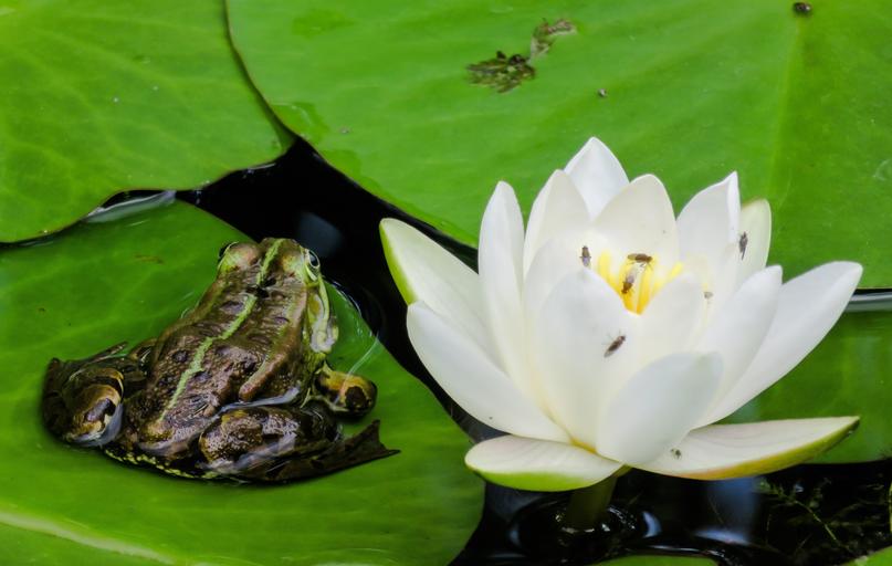 Keywords: frog tree frog water lily blossom bloom leaf pond green amphibian fly mosquito sit