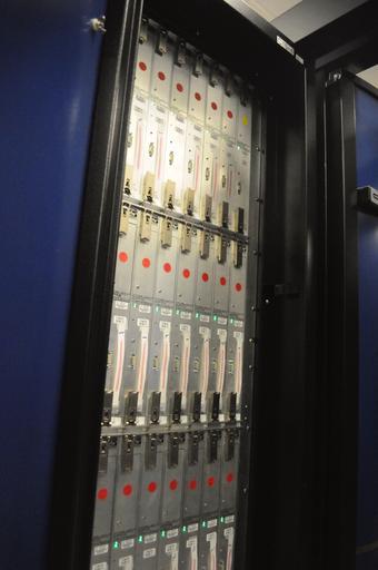 | Keywords: indoor Hotswappable compute modules. Labels on each unit read: "AMD 64 Opteron", "CRAY XT4 COMPUTE MODULE", "XT4 CPM2", "P/N 1000075300", "2.3 Quad Core / 2GB (800) / 16", "RELEASE LEVER TO INITIATE HOT SWAP". Each is labelled with a unique numeric identifier, "04 01", "04 02", etc. from bottom to top and left to right. Each also has a strip of paper with a unique alphanumeric string taped to it. Most units are labelled "2.2 MEZZ", while some are labelled "2.1 MEZZ". Each unit includes a white RS-232 serial port, probably for some type of management device. CC0 waiver: To the extent possible under law, I waive all copyright and related or neighboring rights to this work. Hotswappable compute modules. Labels on each unit read: "AMD 64 Opteron", "CRAY XT4 COMPUTE MODULE", "XT4 CPM2", "P/N 1000075300", "2.3 Quad Core / 2GB (800) / 16", "RELEASE LEVER TO INITIATE HOT SWAP". Each is labelled with a unique numeric identifier, "04 01", "04 02", etc. from bottom to top and left to right. Each also has a strip of paper with a unique alphanumeric string taped to it. Most units are labelled "2.2 MEZZ", while some are labelled "2.1 MEZZ". Each unit includes a white RS-232 serial port, probably for some type of management device. CC0 waiver: To the extent possible under law, I waive all copyright and related or neighboring rights to this work. |