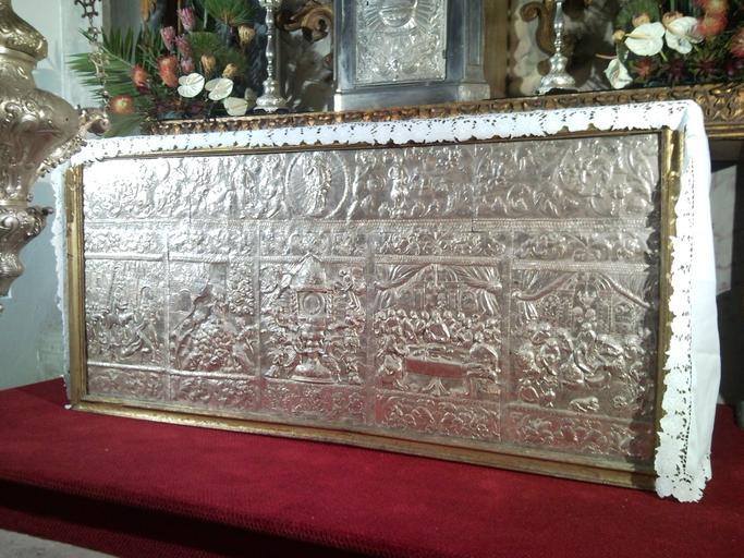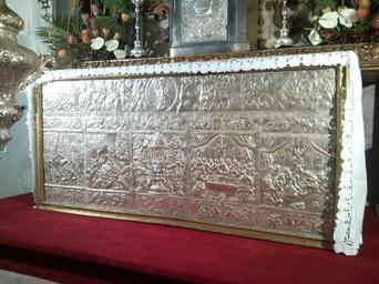 | Keywords: Frontal de prata do altar do Santíssimo Sacramento com iconografia eucarística do século XVIII, Tesouro da Sé de Angra do Heroísmo. Dimensões 140x90 cm..jpg  en Front panel of the main alter 140 x 90 cm with eucharistic iconography from the 18th century Sé Cathedral Sé Angra do Heroísmo Terceira Azores Portugal pt Frontal de prata do altar do Santíssimo Sacramento com iconografia eucarística do século XVIII Tesouro da Sé de Angra do Heroísmo dimensões 140x90 cm Own 10/12/2008 José Luís Ávila Silveira/Pedro Noronha e Costa Arquivo pessoal Sé Catedral de Angra do Heroísmo |