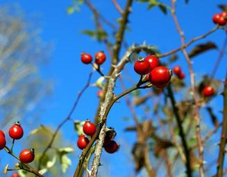Keywords: fruit the fruit of the rose wild rose fruiting autumn nature sunny heat the stems stabbing plants bush shiny hard spikes of rose food sprig red