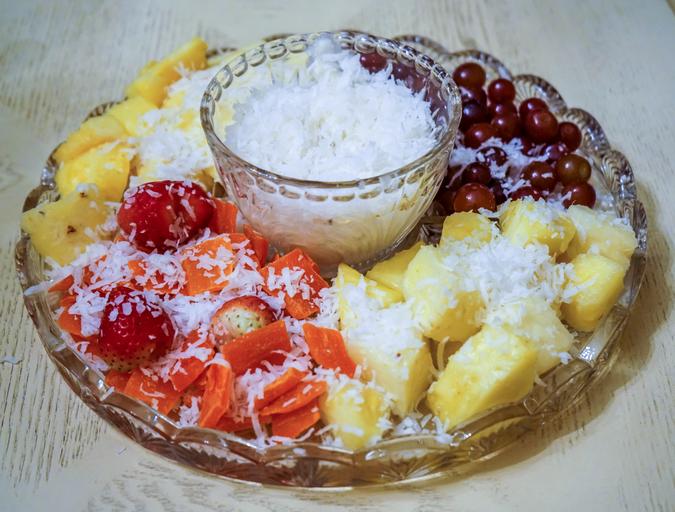Keywords: fruit platter fruit food snack fresh healthy plate colorful grapes gourmet strawberries bananas pineapple coconut dip sweet dessert