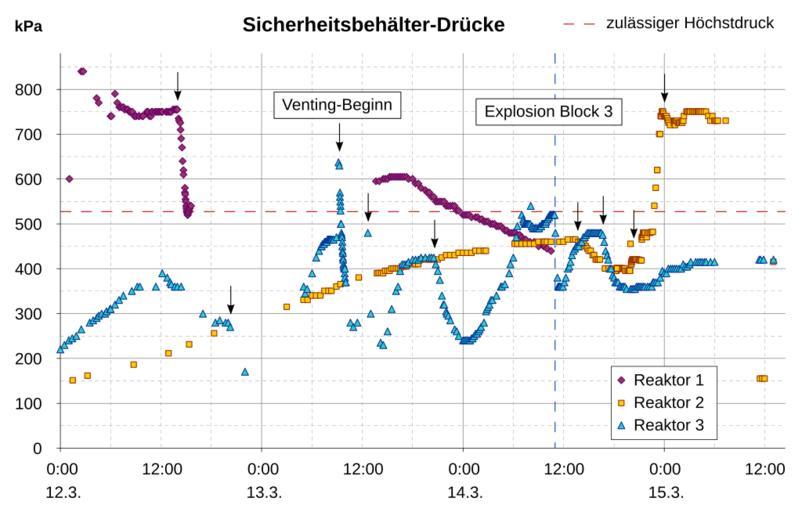 | Keywords: Fukushima I accidents containment pressures.svg bekannten Venting-Startzeitpunkten zwei vermuteten Ventings Datenquelle http //www tepco co jp/en/nu/fukushima-np/index-e html; Höchstdruck 427 MPag 527 MPa bei BWR/3 und BWR/4 laut http //www kantei go jp/foreign/kan/topics/201106/pdf/chapter_iv-2 pdf own PM3 2011-06-07 Cc-zero Data graphs relating to the Fukushima I Nuclear Power Plant SVG charts in German | ||||