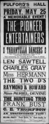 Keywords: poster blackandwhite monochrome text black and white Arrangement of text. "The Pioneer Entertainers" is white on a black panel. Quantity: 1 b&w art print(s). Physical Description: Woodblock, black on white paper, 1005 x 383 mm. Evening Post (Wellington, N.Z.). Fulford's Hall, Brooklyn :Friday, May 25 [1906]; A memorable event, The Pioneer Entertainers, headed by the 8 Tarantella Dancers ... and introducing ... Len Sawtell ... Charles Gray ... Miss Hermann ... The Two D's ... Raymond & Howard ... Miss Muriel Devine ... The Hunting Trio ... Frank Bust ... C. E. Thompson. Printed at the Evening Post Theatrical and General Show Printing Works, Willis Street, Wellington - 14462.. Ref: Eph-E-VARIETY-1906-01. Alexander Turnbull Library, Wellington, New Zealand. natlib.govt.nz/records/22760020 Arrangement of text. "The Pioneer Entertainers" is white on a black panel. Quantity: 1 b&w art print(s). Physical Description: Woodblock, black on white paper, 1005 x 383 mm. Evening Post (Wellington, N.Z.). Fulford's Hall, Brooklyn :Friday, May 25 [1906]; A memorable event, The Pioneer Entertainers, headed by the 8 Tarantella Dancers ... and introducing ... Len Sawtell ... Charles Gray ... Miss Hermann ... The Two D's ... Raymond & Howard ... Miss Muriel Devine ... The Hunting Trio ... Frank Bust ... C. E. Thompson. Printed at the Evening Post Theatrical and General Show Printing Works, Willis Street, Wellington - 14462.. Ref: Eph-E-VARIETY-1906-01. Alexander Turnbull Library, Wellington, New Zealand. natlib.govt.nz/records/22760020 |