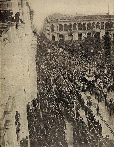 | Keywords: Funeral de Mariano Casanova.JPG es Fotografia del Funeral de Arzobispo Mariano Casanova Vista de la Plaza de Armas de Santiago al momento de llegar la carroza y el cortejo fĂșnebre http //www memoriachilena cl/archivos2/pdfs/MC0049875 pdf author 1908 PD-old PD-Chile Mariano Casanova Funerals in Chile |