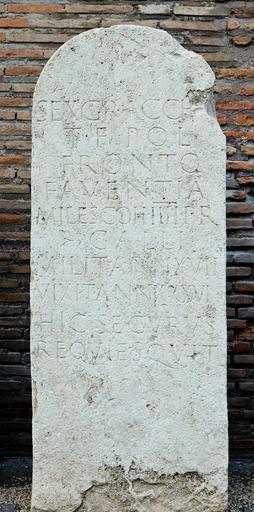 | Keywords: Funerary stele Praetorian Guard Terme n2.jpg Funerary stele of Sex tus Gracch us Pol io member of the 4th cohort of the Praetorian Guard Travertine late 1st century CE “early 2nd century From the right bank of the Tiber near Ponte Milvio Stèle funéraire d'un membre de la garde prétorienne Travertin fin du Ier siècle ap J -C -début du du IIe siècle Provenance rive droite du Tibre près du pont Milvius Museum Terme di Diocleziano Gardens Année épigraphique 1966 33 object history credit line accession number Jastrow 2006 other versions Ancient Roman funerary steles in Rome Rome Ancient Roman inscriptions in the Museo delle Terme di Diocleziano Ancient Roman inscriptions in Rome Massimo Ancient Roman gravestones in Rome Massimo 2nd century Praetorian Guard AE 1966 0033 |