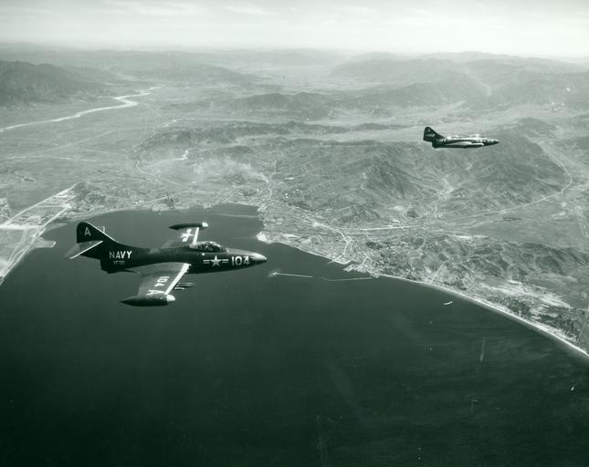 | Keywords: outdoor aerial monochrome 80-G-431907. Grumman F9F-2 "Panther" fighters, of Fighter Squadron 721 (VF-721) from USS Boxer (CV-21) Over Wonsan, North Korea, during the Seige of Wonsan. Photo is dated 15 July 1951. Note rockets under the planes' wings, Wonsan port area behind them. Wonsan airfield is at left with the Namdae River beyond. Official U.S. Navy Photograph, now in the collections of the National Archives. 80-G-431907. Grumman F9F-2 "Panther" fighters, of Fighter Squadron 721 (VF-721) from USS Boxer (CV-21) Over Wonsan, North Korea, during the Seige of Wonsan. Photo is dated 15 July 1951. Note rockets under the planes' wings, Wonsan port area behind them. Wonsan airfield is at left with the Namdae River beyond. Official U.S. Navy Photograph, now in the collections of the National Archives. |
