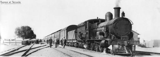 Keywords: G class + Trans-Australian Express, Tarcoola, 1920s.jpg Commonwealth Railways Commonwealth Railways G class G class locomotive with a westbound Trans-Australian Trans-Australian Express at Tarcoola South Australia on the Trans-Australian Railway <p>The number of the locomotive is not clear but it appears to be G20 which was built by Toowoomba Foundry Toowoomba Queensland Australia G20 entered service in June 1917 and was officially withdrawn in May 1952 At the time this photo was taken early in its service life it had a kerosene headlight <p>Some of the information provided here about the image is obtained from Fluck Ronald E; Marshall Barry; Wilson John 1996 Locomotives and Railcars of the Commonwealth Railways Welland SA Gresley Publishing pp 25-29 ISBN 0959969039 1925 https //www flickr com/photos/cpdbear/4517724440/ Flickr - uploader to Flickr claims reproduction rights but image is Public Domain author 30 42 38 9 S 134 34 1 1 E heading E Custom license marker 2014 05 11 PD-Australia Uploaded with UploadWizard 1925 in rail transport in Australia Commonwealth Railways G class locomotives Tarcoola South Australia Trains facing right Trans-Australian Trans Australian railway 1925 in South Australia |