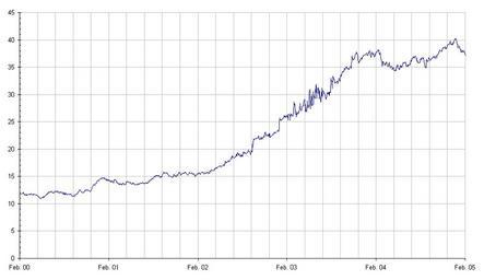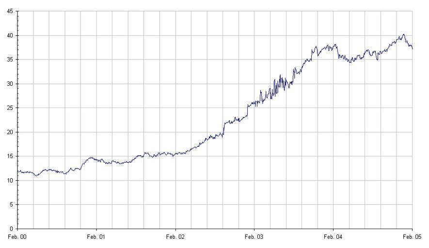 Keywords: Gambia dalasi 5Jahre.png Beschreibung Kursverlauf EUR/GMD Zeitskala 5 Jahre Quelle Chart selbst erstellt am 09 Februar 2005 Fotograf oder Zeichner --Atamari 16 08 9 Feb 2005 UTC Money of Gambia Graphics by User Atamari Euro exchange rate charts 2005 in Gambia