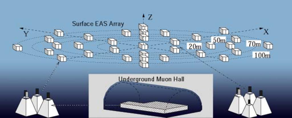 Keywords: Gamma Experiment diagrammatic layout.png en The surface extensive air shower detector stations of GAMMA Experiment are located on 5 concentric circles of radii 20 28 50 70 and 100 m Each station contains 3 square plastic scintillation detectors 3x 1x1x0 05 m<sup>3</sup> to measure the energy deposit of shower charged particles A photomultiplier tube is positioned on the top of the aluminum casing covering each scintillator One of the three detectors of each station is examined by two photomultipliers one of which is designed for fast timing measurements 150 underground muon scintillation detectors muon carpet are compactly arranged in the underground hall under 2 3 Kg/cm<sup>2</sup> of concrete and rock to detect shower muon component with energies more that ~5 GeV GAMMA Collaboration http //www gamma-armenia org/ Samvel Ter-Antonyan 2010-01-10 Cosmic rays