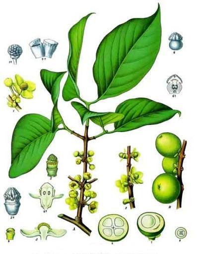 Keywords: Garcinia morella - Köhler–s Medizinal-Pflanzen-063.jpg Garcinia A Blüthenzweig der männlichen Pflanze natürl Grösse; B Fruchtzweig desgl ; 1 Zweigstück mit männlichen Blüthen vergrössert; 1<sup>a</sup> Staubgefässköpfchen nach Hanbury desgl ; 2 Zweigstück mit weiblichen Blüthen desgl ; 3 männliche Blüthe im Längsschnitt desgl ; 4 geöffnetes Staubgefäss desgl ; 4<sup>a</sup> 2 Staubgefässe geöffnet und ungeöffnet nach Bâillon; 5 Fruchtknoten mit Staminodienkranz desgl ; 5<sup>a</sup> dieselbe Figur nach Hanbury; 6 Fruchtknoten mit Narbe desgl nach Hanbury; 6<sup>a</sup> weibliche Blüthe im Längsschnitt desgl ; 6<sup>b</sup> Fruchtknoten im Längsschnitt desgl nach Hanbury; 7 Fruchtquerschnitt mit nur einem fruchtbaren Fache natürl Grösse; 8 derselbe mit 4 fruchtbaren Fächern desgl ; 9 Querschnitt durch den Fruchtknoten vergrössert Garcinia morella Га циния мо елла A цветущая ветвь мужского астения; B плодущая ветвь; 1 часть ветви с мужскими цветками; 1<sup>a</sup> синанд ий по Хэнбе и; 2 часть ветви с женскими цветками; 3 мужской цветок в п одольном аз езе; 4 аск ывшаяся тычинка; 4<sup>a</sup> 2 тычинки аск ывшаяся и не аск ывшаяся по Байону; 5 завязь со с осшимися стаминодиями по Байону; 5<sup>a</sup> то же по Хэнбе и; 6 завязь с ыльцем по Хэнбе и; 6<sup>a</sup> женский цветок в п одольном аз езе; 6<sup>b</sup> завязь в п одольном аз езе по Хэнбе и; 7 попе ечный с ез плода с одним сегментом; 8 то же для плода с 4 сегментами; 9 завязь в попе ечном аз езе 1897 http //pharm1 pharmazie uni-greifswald de/allgemei/koehler/koeh-eng htm List of Koehler Images Franz Eugen Köhler Köhler's Medizinal-Pflanzen PD-old Köhler's Medizinal-Pflanzen Garcinia morella |