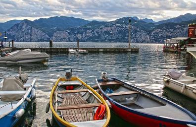 Keywords: garda malcesine port boats fishing boats italy water mountains clouds mood
