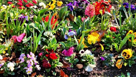 Keywords: garden colorful flora nature spring pink plant yellow red flowers pansy primrose daffodil