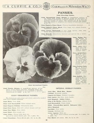 | Keywords: Garden and farm seeds (15750308364).jpg c» £ L« <br> A CURRIE COTft <br> 130 Wisconsin st Milwaukee Wis7ffi <br> PANSIES <br> Giant Flowering Pansies <br> Pkt <br> Giant International Pansy Mixture ” A magnificent mixture of <br> the finest prize strains of Pansies grown by specialists in <br> this country and Europe properly blended so as to give the <br> greatest variety of colors The flowers are of the largest <br> size and cannot be surpassed for beauty of form and texture <br> – fg oz 75c 0 25 <br> Giant Bugnot's Finest Mixed ” Flowers beautifully blotched 10 <br> Giant Cassier's Finest Blixed ” Very large rich colored flowers <br> beautifully blotched 10 <br> Giant Cassier Bridesmaid ” A very large variety color rosy- <br> white with dark blotches in the center ; 10 <br> Giant Butterfly ” Beautifully blotched and spotted like a butter- <br> fly's wings 10 <br> Giant Madam Per- <br> ret ” Shades of <br> pink purple <br> and red splen- <br> didly veined <br> and sometimes <br> margined white 10 <br> Giant Ortier ” Each <br> petal has a dis- <br> tinct blotch <br> with a margin <br> another color <br> 10 <br> Giant Orchid-Flow- <br> ered ” A splen- <br> did mixture <br> mostly light <br> delicate shades <br> The upper pet- <br> als are arranged <br> in small folds <br> giving them an <br> orchid - like ap- <br> pearance - 10 <br> Giant Parisian Stain- <br> ed ” A grand <br> mixture of beau- <br> tiful colors <br> with distinct <br> blotches and <br> splendid sub- <br> stance 10 <br> Siant Ruffled- Mas- <br> terpiece M a m - <br> moth flowers of <br> many bright <br> colors mostly <br> dark The pet- <br> als are heavily <br> ruffled 10 <br> Giant International Pansies <br> Pkt <br> Giant Florists Mixture ” A magnificent mixture of the <br> above named Giant varieties including Giant Tri- <br> mardeau sorts blended so as to produce a splendid <br> combination of colors rV oz 50c 0 15 <br> GIANT TRIMARDEAU PANSIES <br> The flowers are extra large and showy generally marked <br> with three distinct blotches <br> Giant Black ” Very dark <br> Giant Lord Beaconsfield ” Violet shaded white <br> Giant Emperor William ” Ultramarine blue <br> Giant Fiery Faces ” Red with yellow margin and eye <br> Giant Pure White ” Pure white <br> Giant White ” With purple eye <br> Giant Yellow ” Yellow with dark eye <br> Any of the above Giants pkt 10c; 4 pkts 30c <br> Giant Trimardeau ” Finest Mixed pkt 10c; oz 40c <br> IMPERIAL GERMAN PANSIES <br> Azure Blue Black Blue Bronze <br> Cardinal ” Brownish scarlet <br> Coquette de Poissy ” Reddish lavender <br> Fairy Queen ” Sky-blue white border <br> Gold Margined Golden Yellow <br> King of the Blacks ” Almost black <br> Lord Beaconsfield ” Violet shade <br> White Peacoek-Blue spotted Mahogany Color <br> Silver Margined <br> Snowflake ” Pure white <br> Victoria ” Brilliant red <br> Yellow Spotted ” With eye <br> Any of the above named varieties pkt 5c; 3 pkts 10c; <br> 10 pkts 25c <br> Fine Mixed ” All colors Pkt 5c; oz 25c <br> 04 42156516 132761 65916 Page 64 Text http //www biodiversitylibrary org/page/42156516 1912 10 5962/bhl title 65916 A Currie Company ; Henry G Gilbert Nursery and Seed Trade Catalog Collection Biodiversity Heritage Library Garden and farm seeds spring 1912 Garden Stories Bulbs Plants Catalogs Equipment and supplies Flowers Gardening Nurseries Horticulture Plants Ornamental Seeds Vegetables U S Department of Agriculture National Agricultural Library bhl page 42156516 dc identifier http //biodiversitylibrary org/page/42156516 bhlGardenStories BHLinbloom bulbs plants nurseries horticulture plants ornamental u s department of agriculture national agricultural library bhlgardenstories bhlinbloom Information field Flickr posted date ISOdate 2015-01-26 Check categories 2015 August 25 CC-BY-2 0 BioDivLibrary https //flickr com/photos/61021753 N02/15750308364 2015-08-25 06 51 22 cc-by-2 0 PD-old-70-1923 Garden and farm seeds 1912 Photos uploaded from Flickr by Fæ using a script |
