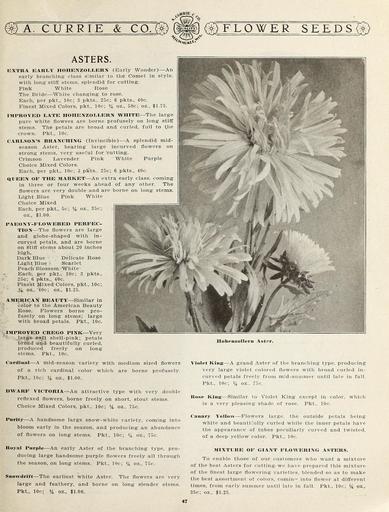 | Keywords: Garden and farm seeds (16185074898).jpg A CURRIE CO <br> FLOWER SEEDS <br> ASTERS <br> EXTRA EARLY HOHENZOLLERN Early Wonder An <br> early branching- class similar to the Comet in style <br> with long- stiff stems splendid for cutting <br> Pink White Rose <br> The Bride White changing to rose <br> Each per pkt 10c; 3 pkts 25c; 6 pkts 40c <br> Finest Mixed Colors pkt 10c; oz 50c; oz <br> IMPROVED LATE HOHE1VZOLLERN WHITE The large <br> pure white flowers are borne profusely on long stiff <br> stems The petals are broad and curled full to the <br> crown Pkt 10c <br> CARLSON'S BRANCHING Invincible A splendid mid- <br> season Aster bearing large incurved flowers on <br> strong stems very useful for cutting <br> Crimson Lavender Pink White Purple <br> Choice Mixed Colors <br> Each per pkt 10c; 3 pkts 25c; 6 pkts 40c <br> QUEEN OF THE MARKET An extra early class coming <br> in three or four weeks ahead of any other The <br> flowers are very double and are borne on long stems <br> Light Blue Pink White <br> Choice Mixed <br> Each per pkt 5c; oz 35c; <br> oz 1 00 <br> PAEON Y-FLOWERED PERFEC- <br> TION The flowers are large <br> and globe-shaped with in- <br> curved petals and are borne <br> on stiff stems about 20 inches <br> high <br> Dark Blue Delicate Rose <br> Light Blue i Scarlet <br> Peaoh Blossom White <br> Each per pkt 10c; 3 pkts <br> 25c; 6 pkts 40c <br> Finest Mixed Colors pkt 10c; <br> J4 oz 40c; oz 1 25 <br> AMERICAN BEAUTY Similar in <br> color to the American Beauty <br> Rose Flowers borne pro- <br> fusely on long stems; large <br> with broad petals Pkt 10c <br> IMPROVED CREGO PINK Very <br> large soft shell-pink; petals <br> broad arid beautifully curled <br> produced freely on long <br> stems Pkt 10c <br> Cardinal A mid-season variety with medium sized flowers <br> of a rich cardinal color which are borne profusely <br> Pkt 10c; Vi oz 1 00 <br> DWARF VICTORIA- -An attractive type with very double <br> reflexed flowers borne freely on short stout stems <br> Choice Mixed Colors pkt 10c; oz 75c <br> Purity A handsome large snow-white variety coming into <br> bloom early in the season and producing an abundance <br> of flowers on long stems Pkt 10c; 14 oz 75c <br> Hohenzollern Aster <br> Violet King A grand Aster of the branching type producing <br> very large violet colored flowers with broad curled in- <br> curved petals freely from mid-summer until late in fall <br> Pkt 10c; 14 oz 75c <br> Rose King; Similar to Violet King except in color which <br> is a very pleasing shade of rose Pkt 10c <br> Canary Yellow Flowers large the outside petals being <br> white and beautifully curled while the inner petals have <br> the appearance of tubes peculiarly curved and twisted <br> of a deep yellow color Pkt 10c <br> Royal Purple An early Aster of the branching type pro- <br> ducing large handsome purple flowers freely all through <br> the season on long stems Pkt 10c; oz 75c <br> Snowdrift The earliest white Aster The flowers are very <br> large and feathery and borne on long slender stems <br> Pkt 10c; oz 1 00 <br> MIXTURE OF GIANT FLOWERING ASTERS <br> To enable those of our customers who want a mixture <br> of the best Asters for cutting- we have prepared this mixture <br> of the finest large flowering varieties blended so as to make <br> the best assortment of colors comin - into flower at different <br> times from early summer until late in fall Pkt 10c; oz <br> 35c; oz 1 25 <br> 47 42156499 132761 65916 Page 47 Text http //www biodiversitylibrary org/page/42156499 1912 10 5962/bhl title 65916 A Currie Company ; Henry G Gilbert Nursery and Seed Trade Catalog Collection Biodiversity Heritage Library Garden and farm seeds spring 1912 Garden Stories Bulbs Plants Catalogs Equipment and supplies Flowers Gardening Nurseries Horticulture Plants Ornamental Seeds Vegetables U S Department of Agriculture National Agricultural Library bhl page 42156499 dc identifier http //biodiversitylibrary org/page/42156499 bhlGardenStories BHLinbloom bulbs plants nurseries horticulture plants ornamental u s department of agriculture national agricultural library bhlgardenstories bhlinbloom Information field Flickr posted date ISOdate 2015-01-26 Check categories 2015 August 25 CC-BY-2 0 BioDivLibrary https //flickr com/photos/61021753 N02/16185074898 2015-08-25 06 51 33 cc-by-2 0 PD-old-70-1923 Garden and farm seeds 1912 Photos uploaded from Flickr by FĂŚ using a script |