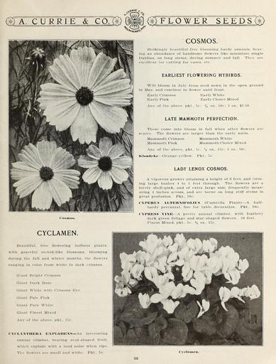 | Keywords: Garden and farm seeds (16186503119).jpg A CURRIE COM <br> FLOWER SEEDSi <br> Cosmos <br> COSMOS <br> Strikingly beautiful free blooming' hardy annuals bear- <br> ing' an abundance of handsome flowers like miniature single <br> Dahlias on long stems during summer and fall They are <br> excellent for cutting for vases etc <br> EARLIEST FLOWERING HYBIRDS <br> Will bloom in July from seed sown in the open ground <br> in May and continue in flower until frost <br> Early Crimson Early White <br> Early Pink Early Choice Mixed <br> Any of the above pltt 5c; V-t oz 50c; 1 oz 1 50 <br> LATE MAMMOTH PERFECTION <br> These come into bloom in fall when other flowers are <br> scarce The flowers are larger than the early sorts <br> Mammoth Crimson Mammoth White <br> Mammoth Pink Mammoth Choice Mixed <br> vVny of the above pkt 5c; oz 15c; 1 oz 50e <br> Ivlonilvkt- ” Orange-yellow Pkt 5c <br> LADY LENOX COSMOS <br> A vigorous grower attaining a height of 6 feet and form- <br> ing large bushes 4 to 5 feet through The flowers are a <br> lovely shell-pink and of extra large size frequently meas- <br> uring 4 inches across and are borne on long stiff stems in <br> great profusion Pkt 10c <br> CYPERUS ALiTERNIFOliItrS Umbrella Plant ” A half- <br> hardy perennial fine for table decoration Pkt 10c <br> CYPRESS VINE ” A pretty annual climber with feathery <br> dark green foliage and star-shaped flowers 20 feet <br> Finest Mixed pkt 5c; oz 15c <br> CYCLAMEN <br> Beautiful free flowering bulbous plants <br> with graceful orchid-like blossoms blooming <br> during the fall and winter months the flowers <br> ranging in color from white to dark crimson <br> Giant Bright Crimson <br> Giant Dark Rose <br> Giant White with Crimson Eye <br> Giant Pale Pink <br> Giant Pure White <br> Giant Finest Mixed <br> Any of the above pkt 15c <br> CYCLAXTHERA EXIM ODENS ” An interesting <br> annual climber bearing oval-shaped fruit <br> which explode with a loud noise when ripe <br> The flowers are small and white Pkt 5c <br> ' ' <br> » w <br> / »i <br> <br> Cyclamen 42156505 132761 65916 Page 53 Text http //www biodiversitylibrary org/page/42156505 1912 10 5962/bhl title 65916 A Currie Company ; Henry G Gilbert Nursery and Seed Trade Catalog Collection NameFound Cyperus NameConfirmed Cyperus EOLID 29130 NameBankID 2576446 Biodiversity Heritage Library Garden and farm seeds spring 1912 Garden Stories Bulbs Plants Catalogs Equipment and supplies Flowers Gardening Nurseries Horticulture Plants Ornamental Seeds Vegetables U S Department of Agriculture National Agricultural Library bhl page 42156505 dc identifier http //biodiversitylibrary org/page/42156505 bhlGardenStories BHLinbloom bulbs plants nurseries horticulture plants ornamental u s department of agriculture national agricultural library bhlgardenstories bhlinbloom Information field Flickr posted date ISOdate 2015-01-26 Check categories 2015 August 25 CC-BY-2 0 BioDivLibrary https //flickr com/photos/61021753 N02/16186503119 2015-08-25 06 52 52 cc-by-2 0 PD-old-70-1923 Garden and farm seeds 1912 Photos uploaded from Flickr by Fæ using a script |