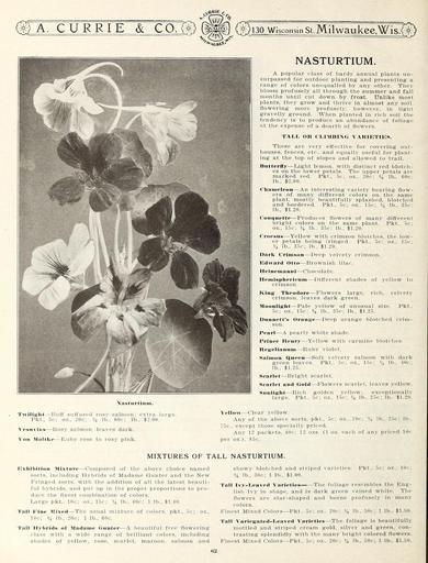 | Keywords: Garden and farm seeds (16186523179).jpg A CURRIE COJ <br> vxVlftlt <br> 130 Wisconsin St Milwaukee Wis <br> NASTURTIUM <br> A popular class of hardy annual plants un- <br> surpassed for outdoor planting- and presenting a <br> range of colors unequalled by any other They <br> bloom profusely all through the summer and fall <br> months until cut down by frost Unlike most <br> plants they grow and thrive in almost any soil <br> flowering more profusely however in light <br> gravelly ground When planted in rich soil the <br> tendency is to produce an abundance of foliage <br> at the expense of a dearth of flowers <br> TALI OR CLIMBING VARIETIES <br> These are very effective for covering out- <br> houses fences etc and equally useful for plant- <br> ing at the top of slopes and allowed to trail <br> Butterfly ” Light lemon with distinct red blotch- <br> es on the lower petals The upper petals are <br> marked red Pkt 5c; oz 20c; lb 60c; <br> lb 2 00 <br> Chameleon ” An interesting variety bearing flow- <br> ers of many different colors on the same <br> plant mostly beautifully splashed blotched <br> and bordered Pkt 5c; oz 15c; lb 35c; <br> lb 1 20 <br> Couquette ” Produces flowers of many different <br> bright colors on the same plant Pkt 5c; <br> oz 15c lb 35c; lb 1 20 <br> Croesus ” Yellow with crimson blotches the low- <br> er petals being fringed Pkt 5c; oz 15c; <br> lb 35c; lb 1 20 <br> Dark Crimson ” Deep velvety crimson <br> Edward Otto ” Brownish lilac <br> 1 1 fin ¢ – ma mi i ” Chocolate <br> -Different shades of yellow to <br> velvety <br> Pkt <br> blotched crim- <br> Nasturtium <br> Twilight ” Buff suffused rosv-salmon; extra large <br> Pkt 5c; oz 20c; 14 lb 60c; lb 2 00 <br> Vesuvius ” Rosy salmon leaves dark <br> Yon nioltke ” Ruby rose to rosy pink <br> Heinisiilierieum- <br> crimson <br> King Theodore ” Flowers large rich <br> crimson leaves dark green <br> Moonlight ” Pale yellow of unusual size <br> 5c; oz 15c; lb 35c; lb 1 25 <br> Dunnett's Orange ” Deep oranj <br> son <br> Pearl ” A pearly white shade <br> Prinee Henry ” Yellow with carmine blotches <br> Kegelianuni ” Ruby violet <br> Salmon Q ueeu ” Soft velvety salmon with dark <br> green leaves Pkt 5c; oz 15c; l / t lb - 40c; <br> lb 1 25 <br> Searlet ” Bright scarlet <br> Searlet and Gold ” Flowers scarlet leaves yellow <br> Sunlight ” Rich golden vellow; exceptionally <br> large Pkt 5c; oz 15c; lb 35c; lb 1 20 <br> Vellow ” Clear yellow <br> Any of the above sorts pkt 5c; oz 10c; lb 25c; lb <br> 75c except those specially priced <br> Any 12 packets 40c; 12 ozs 1 oz each of any priced 10 c <br> per oz 85c <br> MIXTURES OF TALL NASTURTIUM <br> Exhibition Mixture ” Composed of the above choice named <br> sorts including Hybrids of Madame Gunter and the New <br> Fringed sorts with the addition of all the latest beauti- <br> ful hybrids and put up in the proper proportions to pro- <br> duce the finest combination of colors <br> Large pkt 10c; oz 15c; M lb 40c; 1 lb 1 40 <br> Tall Fine Mixed ” The usual mixture of colors pkt 5c; oz <br> 10c; lb 20c; 1 lb 60c <br> Tall Hybrids of Madame Gunter ” A beautiful free flowering <br> class with a wide range of brilliant colors including <br> shad es of yellow rose scarlet maroon salmon and <br> showy blotched and striped varieties <br> lb 30c; 1 lb 1 00 <br> Pkt 5c; oz ž 10c; <br> Tall Ivy-Leaved Varieties ” ” The foliage resembles the Eng- <br> lish Ivy in shape and is dark green veined white The <br> flowers are star-shaped and borne profusely in many <br> colors <br> Finest Mixed Colors ” Pkt 5c oz 20c; Vi lb 50c; 1 lb 1 50 <br> Tall Variegated-Leaved Varieties ” The foliage is beautifully <br> mottled and striped cream gold silver and green con- <br> trasting splendidly with the many bright colored flowers <br> Finest Mixed Colors ” Pkt 5c; oz 20c; lb 50c; 1 lb 1 50 <br> ; 42156514 132761 65916 Page 62 Text http //www biodiversitylibrary org/page/42156514 1912 10 5962/bhl title 65916 A Currie Company ; Henry G Gilbert Nursery and Seed Trade Catalog Collection NameFound Vesuvius Biodiversity Heritage Library Garden and farm seeds spring 1912 Garden Stories Bulbs Plants Catalogs Equipment and supplies Flowers Gardening Nurseries Horticulture Plants Ornamental Seeds Vegetables U S Department of Agriculture National Agricultural Library bhl page 42156514 dc identifier http //biodiversitylibrary org/page/42156514 bhlGardenStories BHLinbloom bulbs plants nurseries horticulture plants ornamental u s department of agriculture national agricultural library bhlgardenstories bhlinbloom Information field Flickr posted date ISOdate 2015-01-26 Check categories 2015 August 25 CC-BY-2 0 BioDivLibrary https //flickr com/photos/61021753 N02/16186523179 2015-08-25 06 51 15 cc-by-2 0 PD-old-70-1923 Garden and farm seeds 1912 Photos uploaded from Flickr by Fæ using a script |