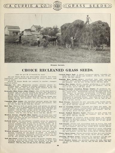 | Keywords: Garden and farm seeds (16250605920).jpg  A CURRIE CO M <br> jf UB <br> GRASS SEEDS <br> Broinus Inermis <br> CHOICE RECLEANED GRASS SEEDS <br> Add 10c per lb if wanted by mail <br> All our Grass Seeds are thoroughly cleaned free from <br> impurities and otherwise first-class in every respect and <br> true to name <br> Prices of Grass Seeds are subject to market changes <br> without notice <br> Timothy  We offer Wisconsin grown strictly choice re- <br> cleaned seed Subject to market changes 45 lbs per <br> bushel Per lb 10c; per peck 1 00; bushel 3 25; 100 <br> lbs 7 00 Seamless bags 20c each <br> Kentucky Blue Grass June Grass  One of the best pasture <br> grasses and one of the earliest to start into growth in <br> spring Fancy cleaned solid seed 20 lbs per bushel <br> per lb 15c; 10 lbs 1 25; 100 lbs 12 00 <br> Extra Fancy Cleaned Solid Seed Free from Chaff  For <br> lawns 21 lbs per bushel Per lb 20c; 10 lbs 1 75; <br> 100 lbs 15 00 <br> Canadian Blue Grass  An excellent pasture grass for thin <br> clay soils Fancy cleaned seed 20 lbs per bushel Per <br> lb 15c; 10 lbs 1 25; 100 lbs 12 00 <br> Red Top  Thrives well on moist land and grows on almost <br> any soil It is a splendid grass to mix with Timothy for <br> meadows and pasture Solid Unhulled Seed 20 lbs per <br> bushel Per lb 15c; 10 lbs 1 25; 100 lbs 12 00 <br> Fancy Cleaned Solid Seed Free from Chaff 42 lbs per <br> bushel Per lb 25c; 10 lbs 2 25; 100 lbs 20 00 <br> Meadow Fescue English Blue Grass  A favorite hay and <br> pasture grass It is very hardy growing luxuriantly on <br> almost any soil 22 lbs per bushel Per lb 15c; 10 lbs <br> 1 25; 100 lbs 10 50 <br> Orchard Grass  An exceedingly valuable grass for pastures <br> and hay on account of its earliness and its ability to <br> recover quickly after being cut or closely eaten It is <br> greatly relished by all kinds of stock Grows well on <br> almost any soil but does best on rich moist or clay <br> lands and succeeds splendidly in shady places 14 lbs <br> per bushel Per lb 20c; 10 lbs 1 75; 100 lbs 15 00 <br> Meatlow Foxtail  Succeeds best in strong rich soil and Is <br> greatly relished by all kinds of stock It resembles <br> Timothy somewhat maturing however earlier in the <br> season An excellent pasture grass 10 lbs per bushel <br> Per lb 35c; 10 lbs 2 75; 100 lbs 25 00 <br> Tall Oat Grass  Comes in very early and grows rapidly pro- <br> ducing a heavy crop ready for cutting in June and <br> splendid grass for early and late pasture 10 lbs per <br> bushel Per lb 20c; 10 lbs 1 75; 100 lbs 16 00 <br> Crested Dog's Tail  A dwarf evergreen grass valuable for <br> hard dry soils 20 lbs per bushel Per lb 30c; 10 lbs <br> 2 75; 100 lbs 24 00 <br> English Rye Grass  Makes excellent hay and recovers <br> quickly after cutting making splendid pasture 25 lbs <br> per bushel Per lb 15c; 10 lbs 1 25; 100 lbs 9 00 <br> Italian Rye Grass  Grows rapidly producing a very nutri- <br> cious feed early in spring 18 lbs per bushel Per lb <br> 15c; 10 lbs 1 25; 100 lbs 9 00 <br> Bromus Inermis Awnless Brome Grass  It produces im- <br> mense crops on the arid plains and grows luxuriantly on <br> dry sandy land Withstands extreme drought and heat <br> and thrives in ground occasionally overflowed with <br> water When fully matured it stands 4 to 5 feet high <br> and is ready to cut in June followed quickly by a heavy <br> aftermath of splendid forage Sow from 15 to 20 lbs of <br> seed to the acre 14 lbs per bushel Per lb 20c; 10 lbs <br> 1 75; 100 lbs 15 00 <br> Hard Fescue  Splendid for dry gravelly soils forms excel- <br> lent sheep pasture 14 lbs per bushel Per lb 25c; 10 <br> lbs 2 00; 100 lbs 18 00 <br> Red or Creeping Fescue  Valuable for light dry soils Its <br> creeping and heavy rooting habit makes it particularly <br> adapted for embankments 14 lbs per bushel Per lb <br> ˘ 25c; 10 lbs 2 25; 100 lbs 20 00 <br> Rough Stalked Meadow Grass  Thrives on rich moist soil <br> and shady places 14 lbs per bushel Per lb 40c; 10 <br> lbs 3 75; 100 lbs 35 00 <br> Sheep's Fescue  A compact deep rooted grass not readily <br> affected by drought and is especially adapted for sheep <br> pasture 14 lbs per bushel Per lb 25c; 10 lbs 2 00; <br> 100 lbs 18 00 <br> Tall Fescue  Grows tall succeeding well on heavy clay and <br> moist soils or on land that is occasionally overflowed 14 <br> lbs per bushel Per lb 25c; 10 lbs 2 25; 100 lbs 20 00 <br> Wood Meadow Grass  Especially adapted to moist rich soils <br> and shady places forming a close and compact turf 14 <br> lbs per bushel Per lb 40c; 10 lbs 3 50; 100 lbs 30 00 <br> Water Spear Grass  Grows naturally on'low wet soil 14 lbs <br> per bushel Per lb 50c; 10 lbs 4 50; 100 lbs 42 50 <br> Floating Meadow Grass  Valuable for marshes 14 lbs -per <br> bushel Per lb 50c; 10 lbs 4 50; 100 lbs 42 50 <br> Fowl Meadow Grass  An excellent grass for low wet land <br> 12 lbs per bushel Per lb 40c; 10 lbs 3 50; 100 lbs <br> 30 00 <br> 39 42156365 132760 65915 Page 39 Text http //www biodiversitylibrary org/page/42156365 1913 10 5962/bhl title 65915 A Currie Company ; Henry G Gilbert Nursery and Seed Trade Catalog Collection NameFound Bromus NameConfirmed Bromus EOLID 108079 NameBankID 2660780 NameFound Inermis NameConfirmed Inermis NameBankID 5121639 Biodiversity Heritage Library Garden and farm seeds spring 1913 um Garden Stories Bulbs Plants Catalogs Equipment and supplies Flowers Gardening Nurseries Horticulture Plants Ornamental Seeds Vegetables U S Department of Agriculture National Agricultural Library bhl page 42156365 dc identifier http //biodiversitylibrary org/page/42156365 bhlGardenStories Grass seeds A Currie Co BHLinbloom bulbs plants nurseries horticulture plants ornamental u s department of agriculture national agricultural library bhlgardenstories a currie co bhlinbloom Information field Flickr posted date ISOdate 2015-02-03 Check categories 2015 August 25 CC-BY-2 0 BioDivLibrary https //flickr com/photos/61021753 N02/16250605920 2015-