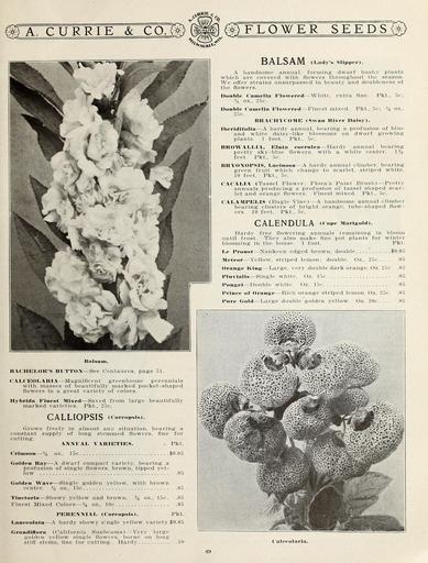 Keywords: Garden and farm seeds (16346743906).jpg dSSEJJL <br> A CURRIE Ca <br> FLOWER SEEDSi <br> Balsam <br> BACHELOR'S BUTTON See Centaurea page 51 <br> CALCEOLARIA Magnificent greenhouse perennials <br> with masses of beautifully marked pocket-shaped <br> flowers in a great variety of colors <br> Hybrlda Finest Mixed Saved from large beautifully <br> marked varieties Pkt 25c <br> CALLIOPSIS Coreopsis <br> Grows freely in almost any situation bearing a <br> constant supply of long stemmed flowers fine for <br> cutting <br> ANNUAL VARIETIES Pkt <br> Crimson Vi oz 15c 0 05 <br> Golden Ruy A dwarf compact variety bearing a <br> profusion of single flowers brown tipped yel- <br> low 05 <br> Golden Wave Single golden yellow with brown <br> center oz 15e 05 <br> Tinctoria Showy yellow and brown oz 15c 05 <br> Finest Mixed Colors oz 10c 05 <br> PERENNIAL Coreopsis Pkt <br> Lnneeolnta A hardy showy single yellow variety 0 05 <br> Grnndiflorn California Sunbeams Very large <br> golden yellow single lowers borne on long <br> stiff stems fine for cutting Hardy 10 <br> BALSAM Lady's Slipper <br> A handsome annual forming dwarf bushy plants <br> which are covered with flowers throughout the season <br> We offer strains unsurpassed in beauty and doubleness of <br> the flowers <br> Double Cornelia Flowered White extra fine Pkt 5c; <br> Vi oz 25c <br> Double Caineliti Flowered Finest mixed Pkt 5c; oz <br> 25c <br> BRACHYCOME Swan River Daisy <br> Ibcridit'olia A hardy annual bearing a profusion of blue <br> and white daisy-like blossoms on dwarf growing <br> plants 1 foot Pkt 5c <br> BROWALLIA Elata eoerulea Hardy annual bearing <br> pretty sky-blue flowers with a white center 1 <br> feet Pkt 5c <br> BRYONOPSIS Laciiiosa A hardy annual climber bearing <br> green fruit which change to scarlet striped white <br> 10 feet Pkt 5c <br> CACALIA Tassel Flower; Flora's Paint Brush Pretty <br> annuals producing a profusion of tassel shaped scar- <br> let and orange flowers Finest mixed Pkt 5c <br> CALAMPELIS Bugle Vine A handsome annual climber <br> bearing clusters of bright orange tube-shaped flow- <br> ers 10 feet Pkt 5c <br> CALENDULA Cape Marigold <br> Hardy free flowering annuals remaining in bloom <br> until frost They also make fine pot plants for winter <br> blooming in the house 1 foot Pkt <br> Le Proust Nankeen edged brown double 0 05 <br> Meteor Yellow striped lemon; double Oz 25c 05 <br> Orange King Large very double dark orange Oz 25c 05 <br> Pluvialis Single white Oz 15c 05 <br> Pongei Double white Oz 15c 05 <br> Prince of Orange Rich orange striped lemon Oz 25c 05 <br> Pure Gold Large double golden yellow Oz 30c 05 <br> Calceolaria <br> IS 42156501 132761 65916 Page 49 Text http //www biodiversitylibrary org/page/42156501 1912 10 5962/bhl title 65916 A Currie Company ; Henry G Gilbert Nursery and Seed Trade Catalog Collection NameFound Brachycome NameConfirmed Brachycome EOLID 6264712 NameBankID 3443227 NameFound Browallia NameConfirmed Browallia L EOLID 60719 NameFound Bryonopsis NameConfirmed Bryonopsis NameBankID 3450624 NameFound Cacalia NameConfirmed Cacalia L EOLID 2525723 NameBankID 471173 NameFound Calampelis NameConfirmed Calampelis D Don EOLID 23521349 NameBankID 1792288 NameFound Calceolaria NameConfirmed Calceolaria EOLID 72303 NameBankID 2665046 NameFound Calendula NameConfirmed Calendula EOLID 59414 NameBankID 25725 NameFound Calliopsis NameConfirmed Calliopsis EOLID 2748143 NameBankID 4099619 NameFound Centaurea NameConfirmed Centaurea L EOLID 59386 NameFound Coreopsis NameConfirmed Coreopsis L EOLID 38349 NameFound Cornelia NameConfirmed Cornelia EOLID 13316968 NameBankID 3466941 NameFound Elata eoerulea NameFound Laciiiosa NameFound Pluvialis NameConfirmed Pluvialis EOLID 19929 NameBankID 2473350 Biodiversity Heritage Library Garden and farm seeds spring 1912 Garden Stories Bulbs Plants Catalogs Equipment and supplies Flowers Gardening Nurseries Horticulture Plants Ornamental Seeds Vegetables U S Department of Agriculture National Agricultural Library bhl page 42156501 dc identifier http //biodiversitylibrary org/page/42156501 bhlGardenStories BHLinbloom bulbs plants nurseries horticulture plants ornamental u s department of agriculture national agricultural library bhlgardenstories bhlinbloom Information field Flickr posted date ISOdate 2015-01-26 Check categories 2015 August 25 CC-BY-2 0 BioDivLibrary https //flickr com/photos/61021753 N02/16346743906 2015-08-25 06 51 38 cc-by-2 0 PD-old-70-1923 Garden and farm seeds 1912 Photos uploaded from Flickr by FĂŚ using a script |