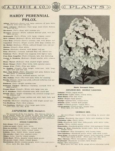 | Keywords: Garden and farm seeds (16346798566).jpg C U R R I E CO <br> u« Rie <br> I L_ _A Nr T S <br> HARDY PERENNIAL <br> PHLOX <br> Albion Medium Bears very large panicles of pure white <br> flowers with faint red eye <br> -Very large snow-white flowers <br> Aglae Adanson Medium - <br> with red eye <br> Bacchante Tall Rose with carmine eye <br> Beranger Dwarf White suffused delicate pink with dis- <br> tinct red eye <br> Bridesmaid Tall White with large crimson center <br> Belle Alliance Medium White with large red eye <br> Clara Benz Dwarf Lovely carmine rose with deeper eye <br> Coqnelicot Dwarf Bright scarlet with deep crimson eye <br> De Miribel Medium White suffused bright rose red eye <br> Diadem Dwarf Pure white <br> Danton Medium Scarlet with deeper red eye <br> Etna Medium Crimson suffused fiery red cherry eye <br> Eclaireur Tall Bright rosy magenta with lighter halo <br> Frau Dora Umgeller Tall Crimson late free flowering <br> George A Stroblein Medium Bright scarlet with crimson <br> eye <br> Henry Marcel Medium Red shaded bright salmon <br> Henry Murger Tall Fine white with carmine center <br> Jeanne d'Arc Tall Fine late white <br> Le Prophet Dwarf Fine bright violet-rose with large <br> light halo and rose eye <br> Mme Paul Dutrle Tall Beautiful soft pink flowers large <br> and borne in immense panicles <br> Mozart Tall White suffused salmon red eye <br> Mrs Jenkins Tall The best early white for massing <br> Pascha Dwarf Deep rosy-pink suffused sulferina-red car- <br> mine-purple eye <br> Pantheon Tall Bright carmine-rose <br> Professor Virchow Medium -Carmine overlaid with or- <br> ange-scarlet <br> Prosper Henri Dwarf White with large rosy eye <br> R P Stmthers Tall Carmine-rose with claret eye <br> Siebold Tall Bright Vermillion red overlaid orange-scar- <br> let crimson eye <br> Sunshine Dwarf Large aniline-red with light halo and <br> crimson eye <br> Vesuvius Medium Dazzling red with bright purple eye <br> Von Hochberg Tall Rich crimson <br> Von Lassburg Medium Very large pure white <br> Price each 15c; doz 1 50 <br> JAPANESE IRIS Kaempferi <br> The grandest of the Iris family The flowers which be- <br> gin to appear about the middle of June are large and of <br> gorgeous colors and are borne in great abundance until the <br> middle of August They succeed under almost all conditions <br> but are especially adapted to rich moist soil <br> SINGLE VARIETIES <br> Date-dougu Rich purple-violet <br> Gekka-no-nami Early pure white <br> Hano-no-nishikl Violet-purple veined white <br> Iso-no-nami Silvery white veined violet <br> Koklrln Rose tinted white veined purple <br> Oku-miyako Light blue marked white <br> Shippo Lilac heavily veined purple <br> Shishi-lkari White densely veined dark purple <br> Shi-un-ryo Light violet veined deeper <br> Shuckinkwa Showy crimson-purple white veins and center <br> Price each 25c; doz 2 50 <br> Hardy Perennial Phlox <br> JAPANESE IRIS DOUBLE VARIETIES <br> Gabisan Violet edged white <br> Koki-no-iro Light violet veined white <br> Mana-dsuru Fine late white <br> Naden Bright royal purple <br> Otorige Aniline-blue veined white <br> Sekizan Lilac veined dark purple <br> Uchiu Crimson-purple veined white <br> Ujl-no-hotaru Violet-purple shaded blue <br> Price each 25c; doz 2 50 <br> GERMAN IRIS <br> An exceedingly hardy class <br> situation <br> succeeding in almost any <br> Cherion Standards lilac-mauve; falls violet shading to blue <br> Florentine Alba Early white <br> Edith Standards light blue; falls purple with white veins <br> Gazelle White frilled mauve <br> Honorabilis Standards golden yellow; falls mahogany brown <br> Johan de Witt Standards bluish-violet; falls deep purple <br> veined white <br> La Tendresse Blue throughout with brown veins <br> Lord Salisbury Standards amber white; falls dark purple <br> Maori King Standards golden yellow; falls chocolate veined <br> white and edged yellow Price each 25c; doz 2 50 <br> Mme Chereau White throughout edged light blue <br> Rembrandt Standards lavender; falls deeper <br> Tineae Blue throughout <br> Price each 15c; doz 1 50 except where otherwise noted 42156529 132761 65916 Page 77 Text http //www biodiversitylibrary org/page/42156529 1912 10 5962/bhl title 65916 A Currie Company ; Henry G Gilbert Nursery and Seed Trade Catalog Collection NameFound Medium NameFound Aglae NameConfirmed Aglae EOLID 2756425 NameBankID 3010353 NameFound Lilac NameConfirmed Lilac P Miller 1754 NameFound Medium NameConfirmed Medium NameBankID 4904049 NameFound Phlox NameConfirmed Phlox L EOLID 40661 NameFound Tineae NameConfirmed Tineae NameFound Vesuvius Biodiversity Heritage Library Garden and farm seeds spring 1912 Garden Stories Bulbs Plants Catalogs Equipment and supplies Flowers Gardening Nurseries Horticulture Plants Ornamental Seeds Vegetables U S Department of Agriculture National Agricultural Library bhl page 42156529 dc identifier http //biodiversitylibrary org/page/42156529 bhlGardenStories BHLinbloom bulbs plants nurseries horticulture plants ornamental u s department of agriculture national agricultural library bhlgardenstories bhlinbloom Information field Flickr posted date ISOdate 2015-01-26 Check categories 2015 August 25 CC-BY-2 0 BioDivLibrary https //flickr com/photos/61021753 N02/16346798566 2015-08-25 06 55 21 cc-by-2 0 PD-old-70-1923 Garden and farm seeds 1912 Photos uploaded from Flickr by Fæ using a script |