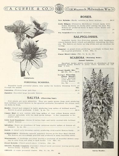 | Keywords: Garden and farm seeds (16371031161).jpg o«£ « <br> A CURRIE COlm <br> vlS 130 Wisconsin St Milwauk ee Wis O <br> h HiY <br> ROSES <br> <br> New Hybrids ” Hardy varieties in finest mixture 0 15 <br> Little Midgets Polyantha Multiflora ” Dwarf hardy little <br> Roses blooming six weeks after sowing the seed The <br> flowers are produced freely in many colors double and <br> semi-double 10 <br> '- <br> Tea Scented ” Choice mixed varieties <br> 15 <br> SALPIGLOSSIS <br> Salpiglossis <br> PERENNIAL SCABIOSA <br> Beautiful hardy free-flowering annuals with handsomely <br> colored flowers finely veined and penciled resembling the Petu- <br> nia The flowers are borne on long stems and are excellent for <br> cutting <br> Emperor ” A grand strain producing exceedingly brilliant flow- <br> ers in great profusion 2 feet Pkt 5c <br> Finest Mixed Colors ” Pkt 5c; oz 20c <br> SCABIOSA Mourning Bride <br> Annual Varieties <br> Excellent border plants producing an abundance of long <br> stemmed double flowers in many colors splendid for cut- <br> ting 2 feet <br> Pkt <br> Dwarf Double Mix- <br> ed ”On 30c 0 05 <br> Large Flowering <br> Finest Mixed ” <br> Tall growing <br> sorts with very <br> large flowers <br> Oz 30c 05 <br> Beautiful hardy perennial plants very useful for borders blooming freely all <br> through the season Pkt <br> Caueasiea ” Flowers large pale blue <br> Japoniea ” Beautiful large lavender flowers <br> 0 10 <br> 30 <br> SALVIA Flowering Sage <br> Few plants are more attractive They are easily grown from seed producing <br> their brilliant colored flowers in the greatest profusion throughout the season until <br> cut down by frost <br> Pkt <br> Bonfire ” Dwarf and compact in habit producing long spikes of brilliant scarlet <br> flowers in great profusion 2 feet oz 75c 0 10 <br> Canary Bird ” A new variety with long spikes of clear yellow flowers which <br> contrast splendidly with the dark green foliage A fine companion to the <br> scarlet sorts <br> 25 <br> Little Lord Fauntleroy ” Grows 18 inches high and fairly covered with brilliant <br> scarlet flowers 10 <br> Splendens ” Bears an abundance of long gorgeous scarlet spikes of flowers all <br> summer oz 40c 05 <br> Zurich ” A dwarf early blooming variety producing vivid scarlet flowers freely 10 <br> SCHIZANTHUS ” Handsome annuals popularly known as the Poor Man's Orchid <br> The flowers are exceedingly graceful and produced in many beautiful colors <br> Wisetonensis ” A handsome pot-plant bearing a profusion of beautiful flowers rang- <br> ing in color from soft pink to dark brown 3 ft Pkt 15c <br> Dwarf Hybrids ” Finest mixed colors 6 inches Pkt 10c <br> SILENK Pendula Couipactn Catchfly ” Dwarf hardy perennial bearing pretty pink <br> flowers freely 6 inches Pkt 5c <br> SMILAX ” A tender perennial climber Pkt 5c; oz 40c <br> M <br> f£L <br> T ' i 'vjP3Sv <br> ir £ t ' 'j i ~Ml <br> ' £ <br> jj J w Sk t ca 3fc£r <br> / M mA s <br> 4 hE <br> 4 iffir A iwI lX <br> W'i <br> h\ <br> ¢ j' ffSrlff <br> fg <br> mL-W ik <br> r A» j2 <br> Salvia Bonfire <br> iS 42156520 132761 65916 Page 68 Text http //www biodiversitylibrary org/page/42156520 1912 10 5962/bhl title 65916 A Currie Company ; Henry G Gilbert Nursery and Seed Trade Catalog Collection NameFound Multiflora NameConfirmed Multiflora Small J M MacDougal Feuillet supersect NameBankID 9260529 NameFound Orchid NameFound Pendula NameFound Salpiglossis NameConfirmed Salpiglossis K Koch EOLID 60720 NameFound Salvia NameConfirmed Salvia L EOLID 38380 NameFound Scabiosa NameConfirmed Scabiosa 'Simon Greaves' EOLID 49101 NameFound Schizanthus NameConfirmed Schizanthus aff pinnatus Reeves 24 EOLID 11884489 NameFound Smilax NameConfirmed Smilax Jorge08 EOLID 3396175 NameFound Splendens NameConfirmed SPLENDENS NameBankID 5329910 Biodiversity Heritage Library Garden and farm seeds spring 1912 Garden Stories Bulbs Plants Catalogs Equipment and supplies Flowers Gardening Nurseries Horticulture Plants Ornamental Seeds Vegetables U S Department of Agriculture National Agricultural Library bhl page 42156520 dc identifier http //biodiversitylibrary org/page/42156520 bhlGardenStories BHLinbloom bulbs plants nurseries horticulture plants ornamental u s department of agriculture national agricultural library bhlgardenstories bhlinbloom Information field Flickr posted date ISOdate 2015-01-26 Check categories 2015 August 25 CC-BY-2 0 BioDivLibrary https //flickr com/photos/61021753 N02/16371031161 2015-08-25 06 52 40 cc-by-2 0 PD-old-70-1923 Garden and farm seeds 1912 Photos uploaded from Flickr by Fæ using a script |