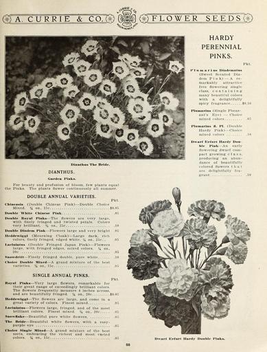 | Keywords: Garden and farm seeds (16372731535).jpg A CURRIE COJ <br> £» <br> FLOWER SEEDS <br> Dianthus The Bride <br> DIANTHUS <br> Garden Pinks <br> For beauty and profusion of bloom few plants equal <br> the Pinks The plants flower continuously all summer <br> DOUBLE ANNUAL VARIETIES <br> Pkt <br> Cbinensis Double Chinese Pink ” Double Choice <br> Mixed Vi oz 15c 0 05 <br> Double White Chinese Pink 05 <br> Double Royal Pinks ” The flowers are very large <br> with finely fringed and twisted petals Colors <br> very brilliant oz 25c 10 <br> Double Diadem Pink ” Flowers large and very bright 05 <br> Heddewiggi Mourning Cloak ” L arge dark rich <br> colors finely fringed edged white oz 25c 05 <br> T aciniatus Double Fringed Japan Pink ” Flowers <br> large with fringed edges mixed colors oz <br> 20c 05 <br> Snowdrift ” Finely fringed double pure white 10 <br> Choice Double Mixed ” A grand mixture of the best <br> varieties oz 15c 05 <br> SINGLE ANNUAL PINKS <br> Pkt <br> Royal Pinks ” Very large flowers remarkable for <br> their great range of exceedingly brilliant colors <br> The flowers frequently measure 4 inches across <br> and are beautifully fringed oz 20c 0 05 <br> Heddewiggi ” The flowers are large and come in a <br> great variety of colors Finest mixed 05 <br> I aciniatus ” Flowers large fringed and of the most <br> brilliant colors Finest mixed oz 20c 05 <br> Snowflake ” Beautiful pure white flowers 05 <br> The Bride ” Beautiful white flowers with a rosy- <br> purple eye - 05 <br> Choice Single Mixed ” A grand mixture of the best <br> sorts embracing the richest and most varied <br> colors oz 15c 05 <br> HARDY <br> PERENNIAL <br> PINKS <br> Pkt <br> I 1 ii in a r i us Diadcinatus <br> Sweet Scented Dia- <br> dem Pink ” A re- <br> markably attractive <br> free flowering single <br> class containing <br> many beautiful colors <br> with a delightfully <br> spicy fragrance 0 10 <br> Plumarius Single Pheas- <br> ant's Eye ” Choice <br> mixed colors 05 <br> Plumarius fl PI Double <br> Hardy Pink ” Choice <br> mixed colors 10 <br> Dwarf Erfurt Hardy Dou- <br> ble Pink ” An early <br> flowering dwarf com- <br> pact growing class <br> producing an abun- <br> dance of beautifully <br> colored flowers that <br> are delightfully fra- <br> grant 10 <br> L £ <br> Dwarf Erfurt Hardy Double Pinks <br> 55 42156507 132761 65916 Page 55 Text http //www biodiversitylibrary org/page/42156507 1912 10 5962/bhl title 65916 A Currie Company ; Henry G Gilbert Nursery and Seed Trade Catalog Collection NameFound Diadcinatus NameFound Dianthus NameConfirmed Dianthus EOLID 11254753 NameBankID 2646562 NameFound I aciniatus NameFound L arge NameFound Plumarius NameConfirmed Plumarius EOLID 12072735 NameBankID 4303501 NameFound T aciniatus Biodiversity Heritage Library Garden and farm seeds spring 1912 Garden Stories Bulbs Plants Catalogs Equipment and supplies Flowers Gardening Nurseries Horticulture Plants Ornamental Seeds Vegetables U S Department of Agriculture National Agricultural Library bhl page 42156507 dc identifier http //biodiversitylibrary org/page/42156507 bhlGardenStories BHLinbloom bulbs plants nurseries horticulture plants ornamental u s department of agriculture national agricultural library bhlgardenstories bhlinbloom Information field Flickr posted date ISOdate 2015-01-26 Check categories 2015 August 25 CC-BY-2 0 BioDivLibrary https //flickr com/photos/61021753 N02/16372731535 2015-08-25 06 53 24 cc-by-2 0 PD-old-70-1923 Garden and farm seeds 1912 Photos uploaded from Flickr by Fæ using a script |
